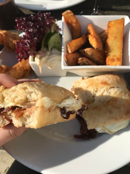 We settled on ordering a sandwich each, trying the cajun chicken & mozzarella that comes with jalepino jam, and the goats cheese with caramalised onion jam. Both were served on toasted ciabata and came with homemade chunky chips, coleslaw, and a huge ale-battered onion ring. Lunch is served as large but very satisfying portions that looked and tasted fantastic! A few gin & tonics later, we started our 6 mile walk home, but we both said we wanted to go back to this lovely little pub for either an evening meal or a Sunday Roast one day.