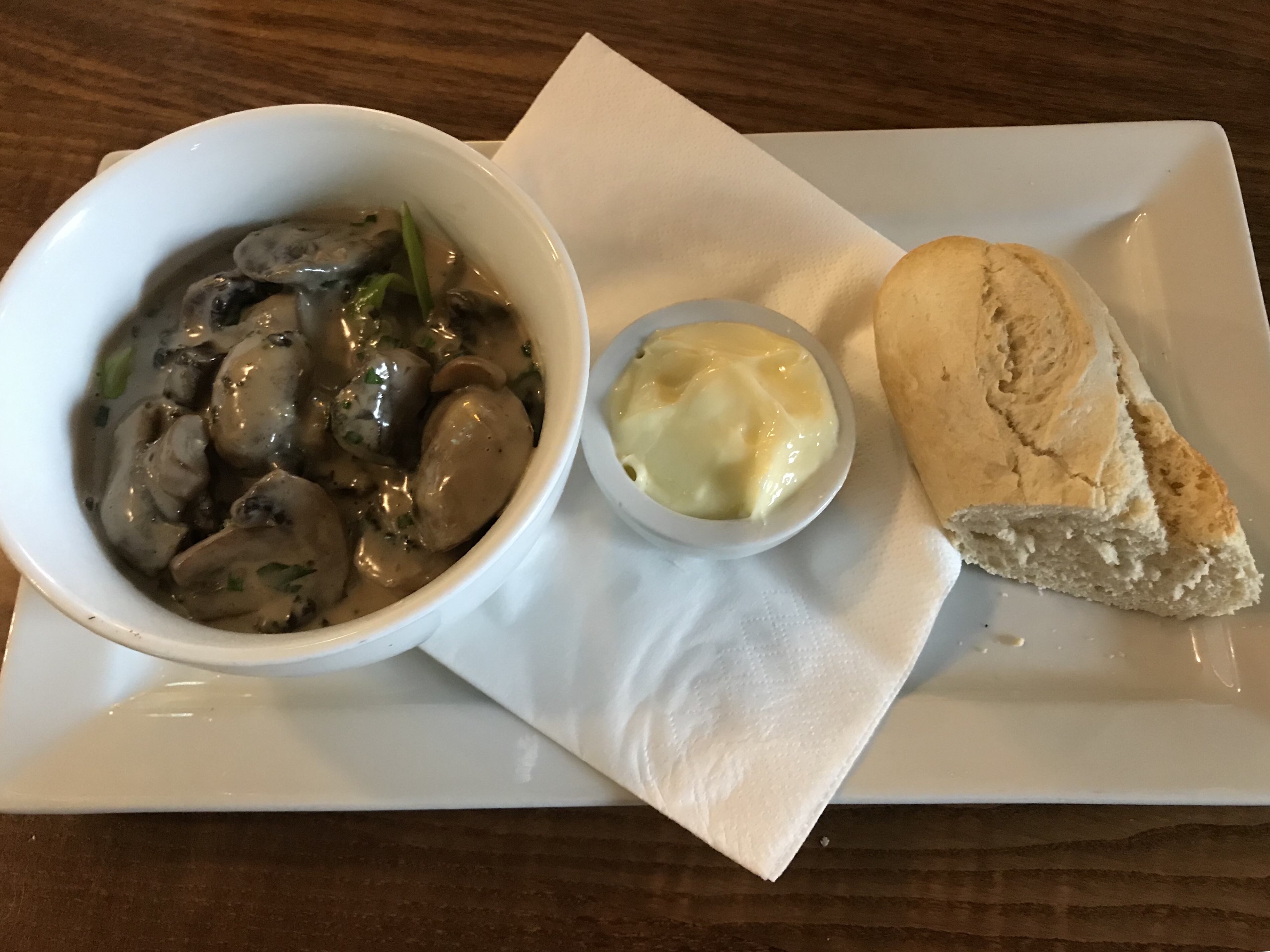 We decided to share the starter of the garlic mushrooms which came in a crème fraiche sauce. These were tasty, and a decent sized portion (not the most photogenic of meals) A few other diners chose the soup which also looked appetising.