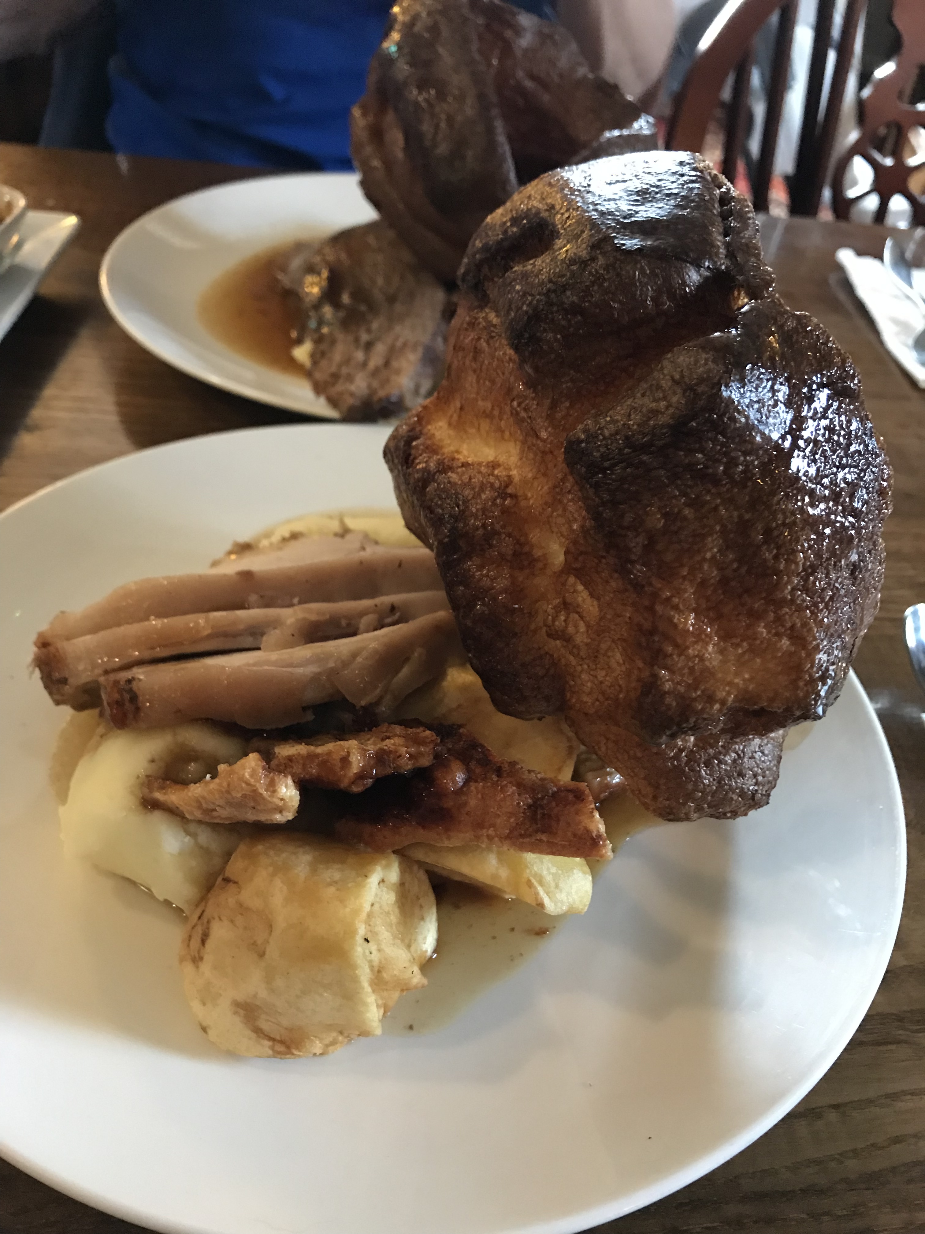 For the main I went for the pork (with crackling of course). Sunday dinners are served as a large portion of creamy mash, roast potatoes, topped with the meat of your choices and then a big Yorkshire. On the side you get cauliflower cheese (yum), carrots, cabbage and broccoli.