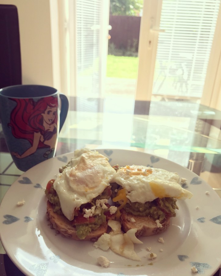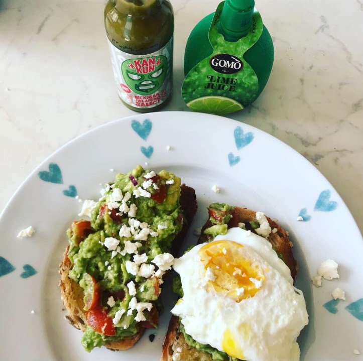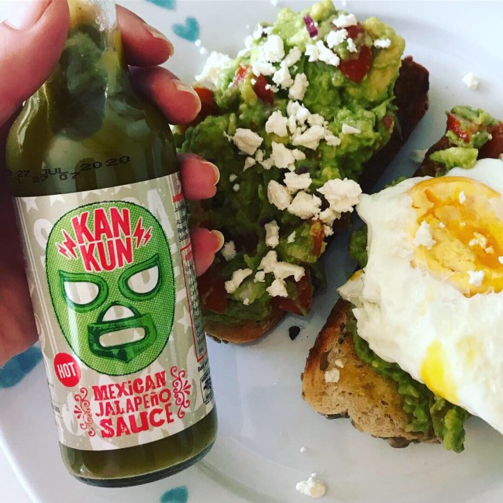One of my favourite things to make for breakfast on a weekend is my homemade spicy guacamole on toast topped with a fried egg, nom nom!! And to add a bit more spice I like to drizzle some Kankun hot sauce on top too.