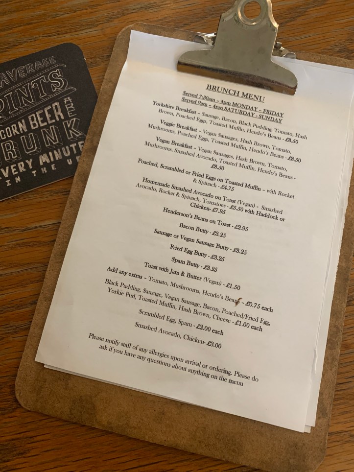 Saturday mornings they open at 9, and we got there around half 9 with a few tables free to sit at, a few taken by people watching the rugby and enjoying breakfast or a hot drink. Their brunch menu is served until 4pm every day of the week and includes full breakfasts with Veggie and Vegan options, as well as various sandwiches. We both decided to go for the Yorkshire Breakfast. I do enjoy a Veggie breakfast usually, however as I am trying my best with Keto at the moment I am avoiding carbs, so the Veggie brekky wouldn’t have left me with much.