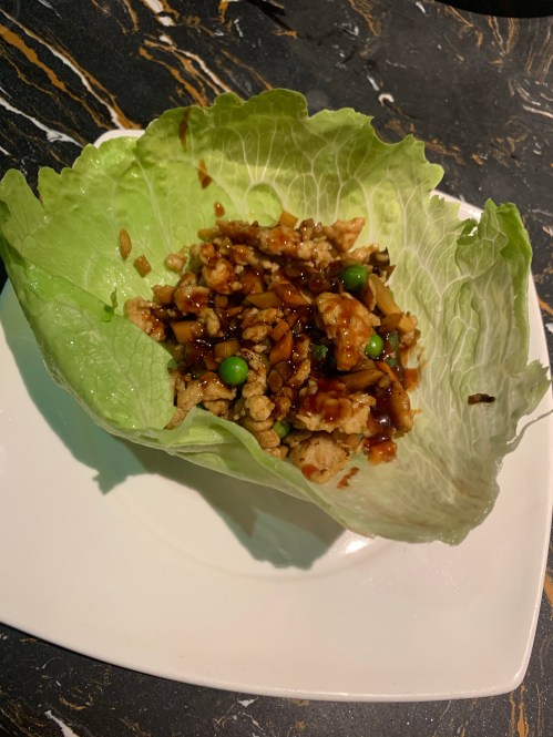 Third course (nope not got to the mains yet) was an appetiser of Minced Chicken Lettuce Wraps. I hadn’t eaten anything like this before but it was bloody lovely to be honest! You are served a plate full of whole lettuce leaves, and a plate full of chopped up chicken and vegetables with lots of hoisin sauce to make your own wraps. Very messy, but really refreshing and delicious. We could have had this as our main to be honest, there was definitely a big enough portion!