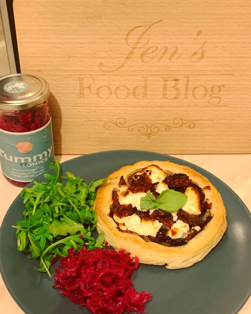Here’s a recipe I have tried recently that’s really simple and quick to make, and really delicious! I came across a similar recipe for this Goats Cheese & Tomato Tart on the Asda website as I fancied giving something a go that I hadn’t made before, to accompany some of the lovely sauerkraut that I have been given from Tummy Tonics. The original recipe used fresh tomatoes, however I had some sun-dried tomatoes in the cupboard so used these instead, which turned out to be a great idea! I also had some green & red pesto’s leftover which I had on the side of the tart and they were delicious.