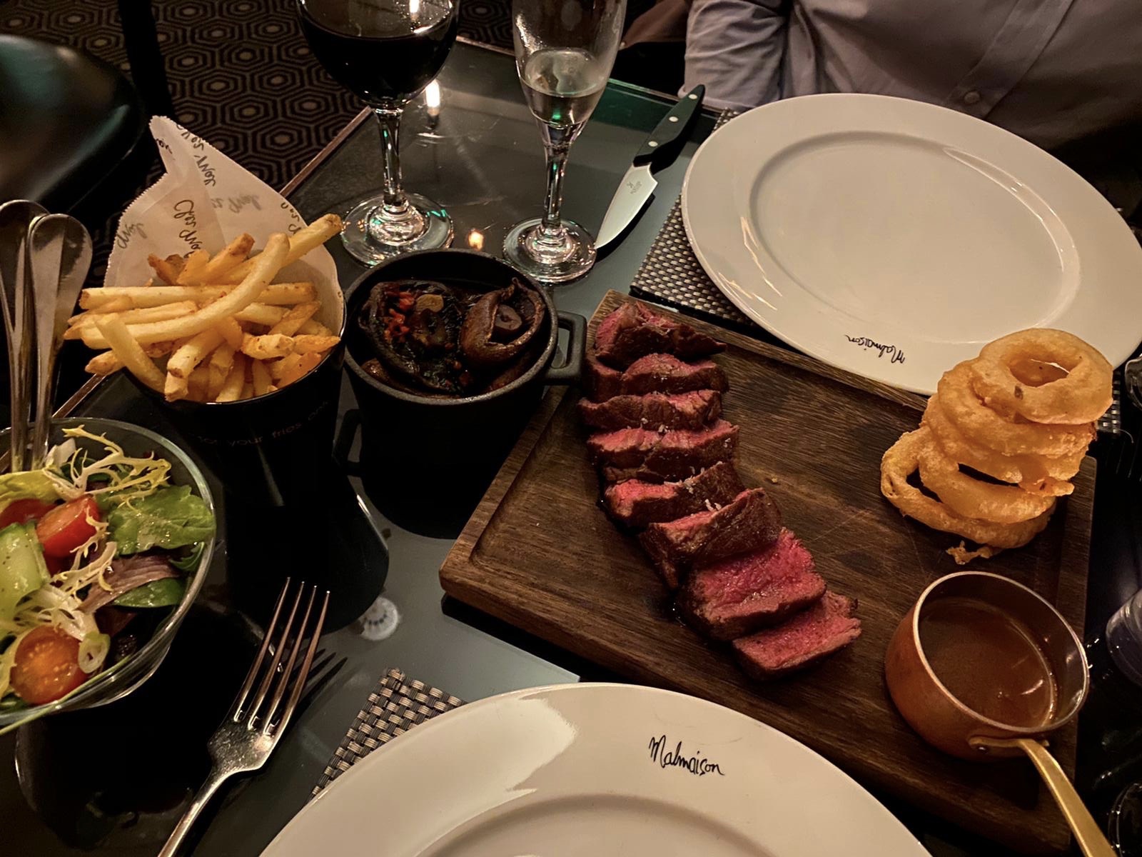 We ordered our steak medium rare and it was cooked to perfection. The amount of food served was just enough and was all delicious, especially the homemade onion rings. Our Prosecco was poured on arrival, and we also chose a bottle of red which went down well. We had a perfect evening there! I would happily go back to to try some of their other dishes on the menu and/or go for a few cosy drinks in the bar.