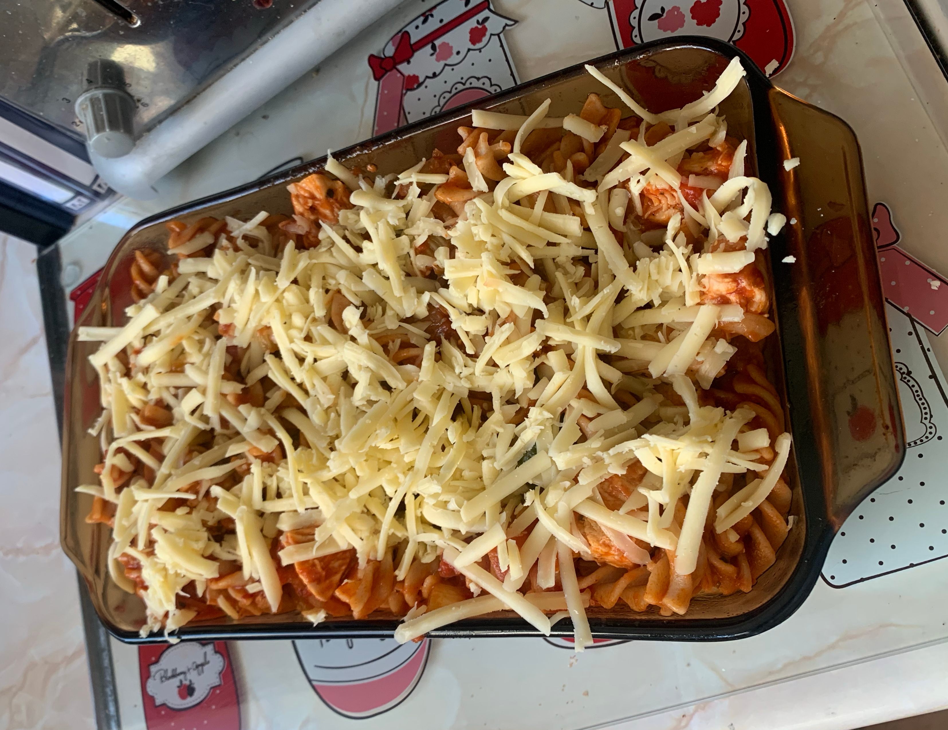 - Cook the pasta in a separate pan of boiling water according to packet instructions, but for half the time (approx 5 – 6 minutes). Once the pasta is part cooked, drain and add to an oven dish. Pour over the contents of the saucepan and mix altogether in the oven dish.