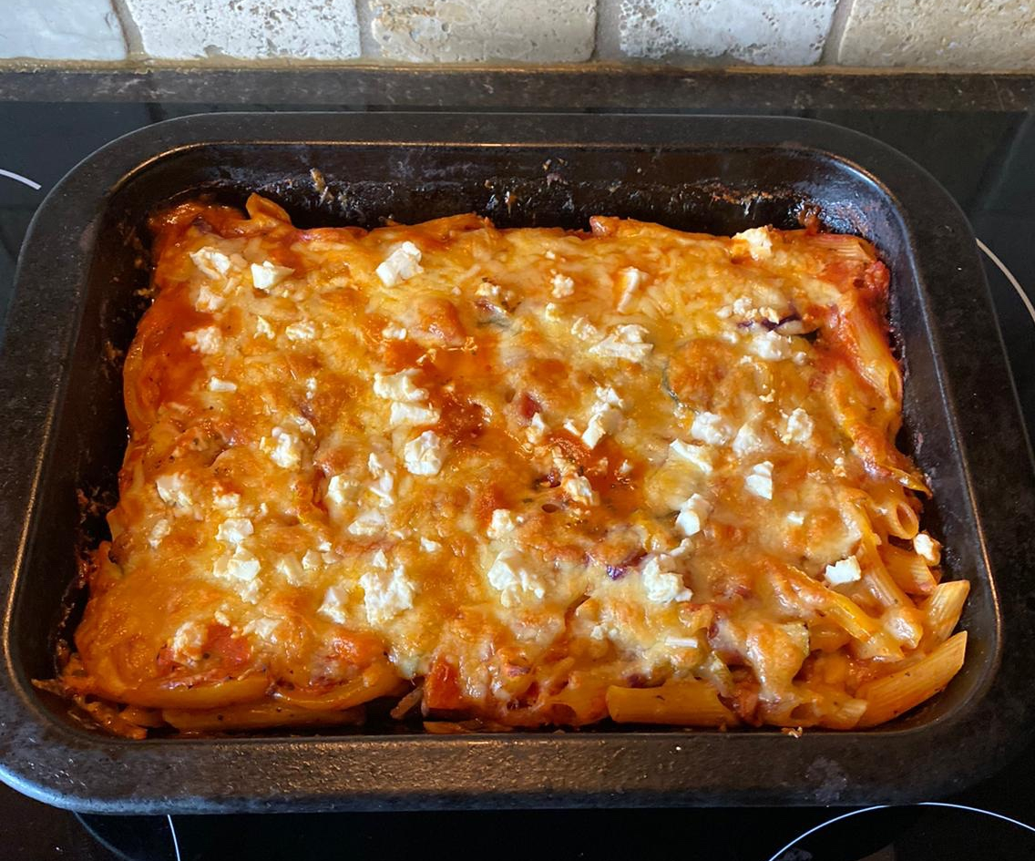 - Sprinkle the cheddar and feta over the to if the pasta bake and place the oven dish in the oven for 20 minutes. Once golden, this should be ready to served with the chilli flakes and basil sprinkled on top (optional).
