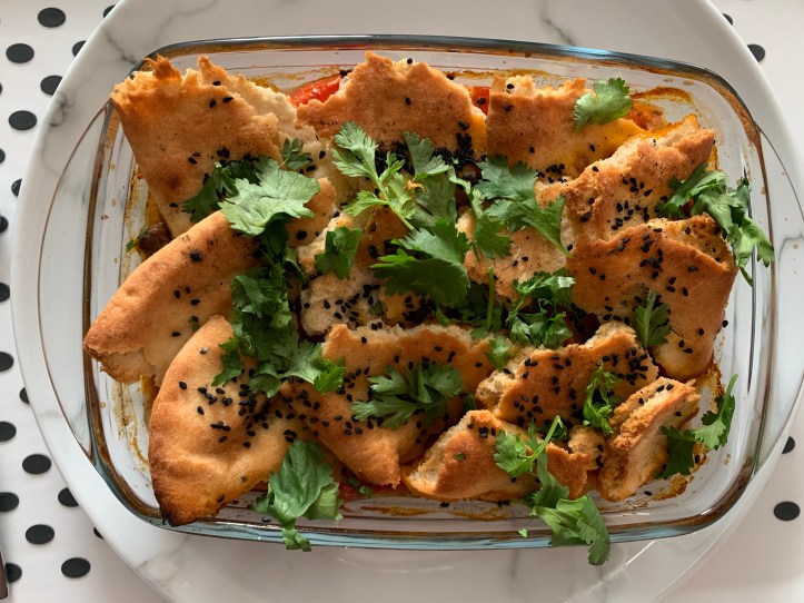- Once the tomatoes have softened, top the lamb rogan josh with the naan bread pieces. Drizzle with vegetable oil and sprinkle with the nigella seeds. Return the dish to the oven for a final 10-15 min or until the naan is crisp and golden – this is your naan-topped lamb rogan josh pie. Leave to stand for 5 min before serving. Garnish with the coriander leaves.
