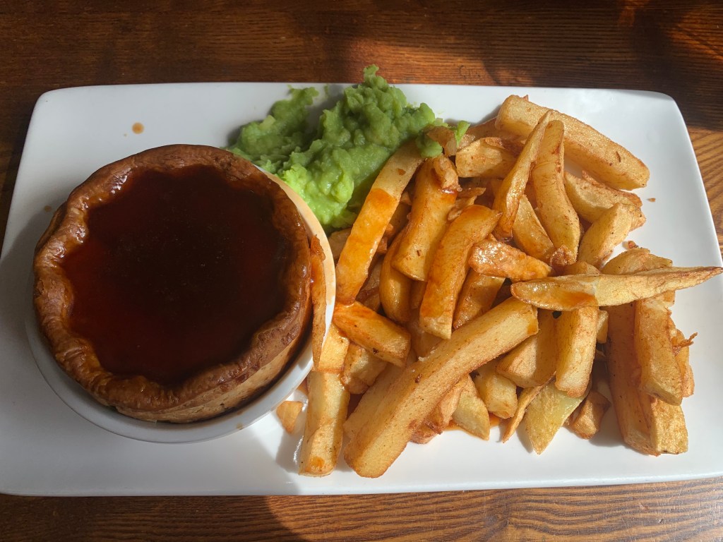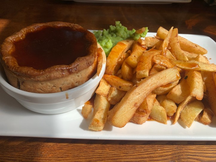Anyway regardless of the service not being the best, the food was REALLY good. I decided in the end to order The Dambuster Pie – steak cooked in bomber ale with shallots and mushrooms in a fully encrusted pastry crust. Which meant a proper pie, none of that stew with a lid business! This is served with chips or mash, and mushy peas or veg. It had to be chips and mushy peas for me, oh and lots of gravy 🙂 I really enjoyed this meal, the chips were like proper chippy chips and there was a mountain of them! So I couldn’t finish everything.