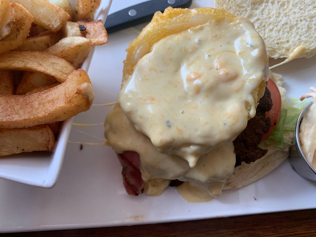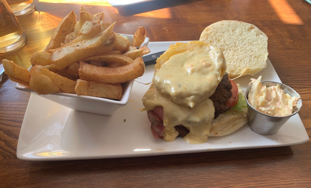 Ben ordered the Black N Blue Burger – 6oz beef burger with cajun seasoning, bacon, an onion ring and melted creamy stilton sauce. This was a big burger, although not the biggest on the menu! It had a decent kick to it with the seasoning and was really tasty. This came with a small bowl (although not a small portion) of chips, and some coleslaw. Every last bit was eaten so it must have been good 🙂