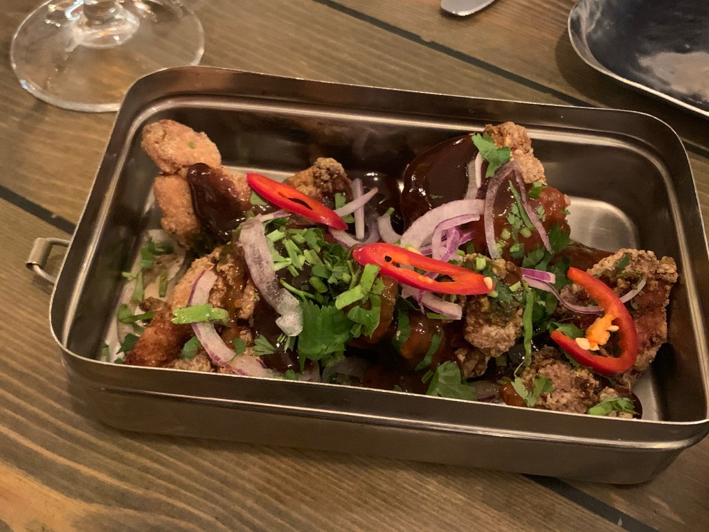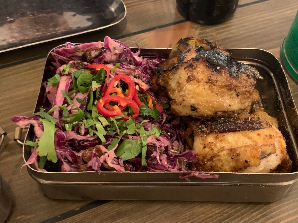 Angry Bird – Succulent chicken thighs marinated & roasted in tandoor spices, yoghurt, ginger & garlic, served with popped mustard Mowgli Slaw. I LOVE chicken thighs, and these were cooked beautifully and tasted really good. The Mowgli Slaw is also really tasty we both loved it.