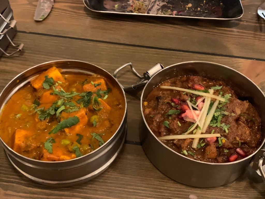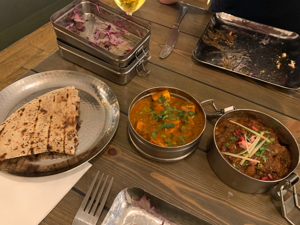 Based on Ecclesall Road in Sheffield, this restaurant has a fantastic atmosphere (which I believe is reflected across all Mowgli restaurants) as soon as you walk in you’re immediately impressed by the décor – trees with fairy lights, swing seats, a copper bar, clean and modern dining area – it really is lovely. The menu is explained well as soon as you’re seated too in that the food is served tapas-style, so dishes are smaller than your usual main meals, and they come out as and when ready served in the middle of the table for everyone to share. The advice is that typically 2-3 dishes each are enough and the menu has Street Food or Curries to choose from, so we decided on 2 street food dishes, 2 curries and 2 roti breads between us – this was definitely enough!