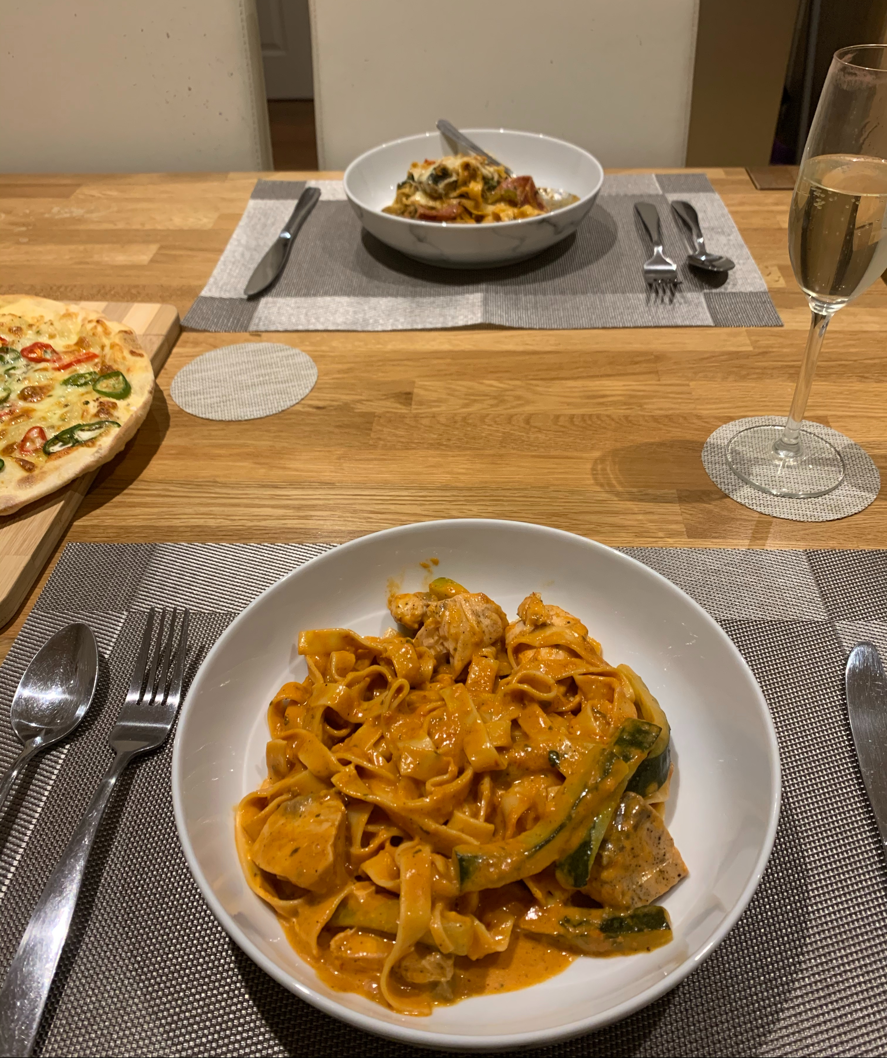 The current takeaway menu consists mainly of a variety of pasta dishes and pizzas with a few meat or fish dishes that come served with vegetables & potatoes as well. To accompany this there are also some garlic bread options. As it was a special occasion, we decided on the pasta rather than pizzas, but couldn’t resist the garlic bread with cheese and chilli as well!