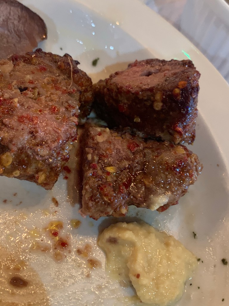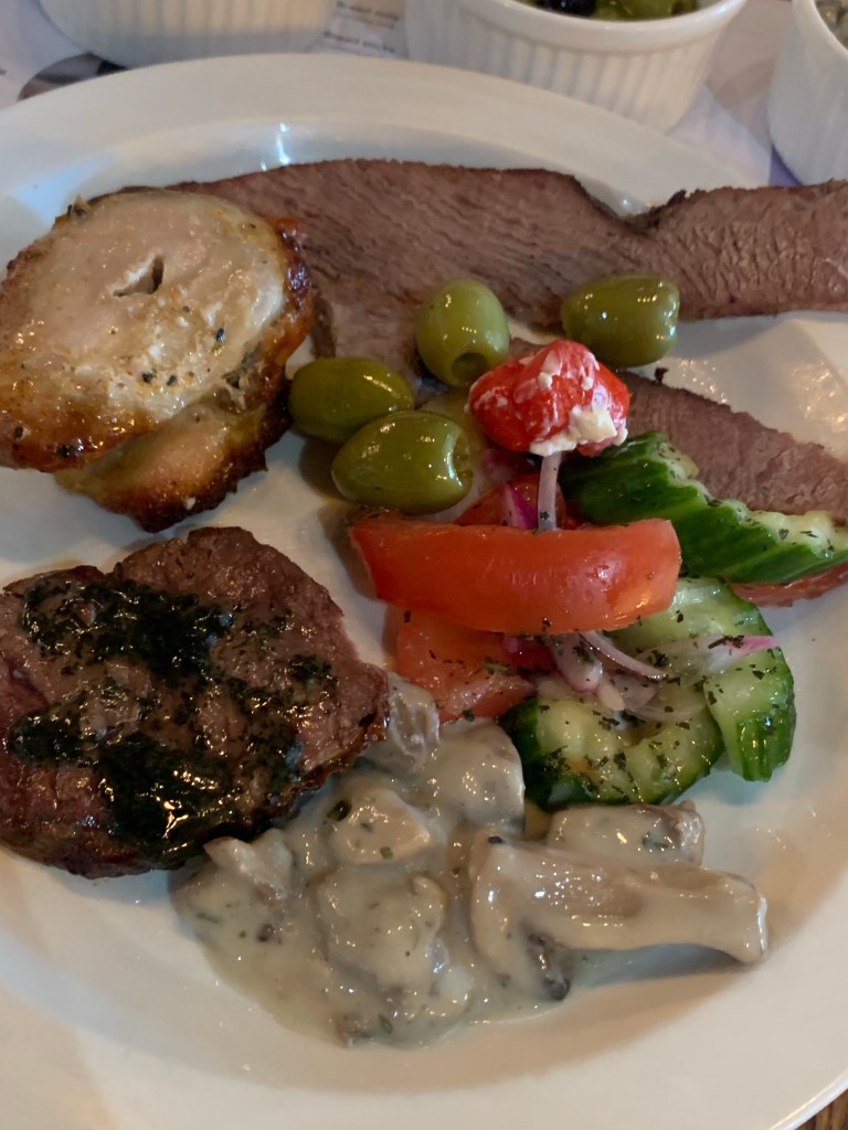 There are a lot of sides on offer such as potatoes, salad, cous cous, stuffed mini peppers, olives, garlic mushrooms etc – you order these 4 at a time and they come in little ramekins to your table so you can pick at these along side your meat – my favourite way of eating.