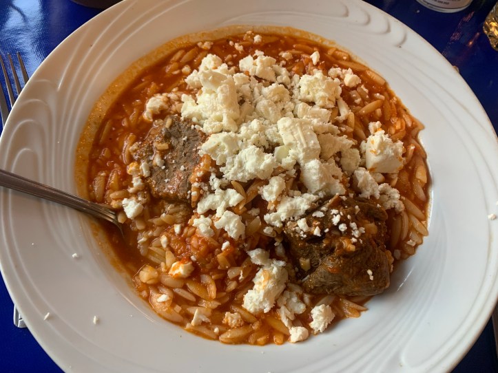 Uvetsi; Pasta rice with beef cooked in tomato sauce and feta cheese. – This was lovely although a large portion (have I mentioned these large portions enough?!) that I ended up boxing up and taking away. However I have to say it was fabulous the next day too! The large chunks of slow-cooked beef were gorgeous and who doesn’t love a generous topping of feta?