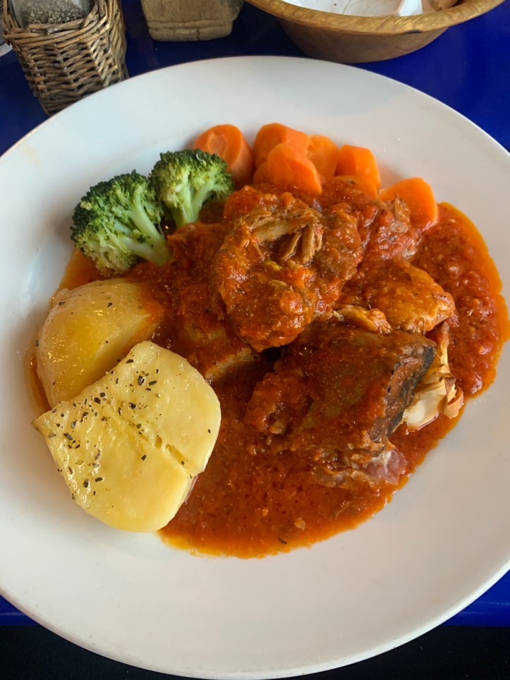 Kleftiko; Leg of lamb cooked in red wine, peppers, carrots, courgettes, garlic, tomato sauce and served in filo pastry with vegetables and roast potatoes. – There was enough to feed 2 people here but the meat was cooked so beautifully it literally melted in your mouth. Lots of vibrant vegetables to accompany and the sauce was really good. Only thing that let the dish down was the pastry; it was mostly sat under the lamb and actually looked like a bit piece of fat rather than pastry because it was soggy, so that was a shame.