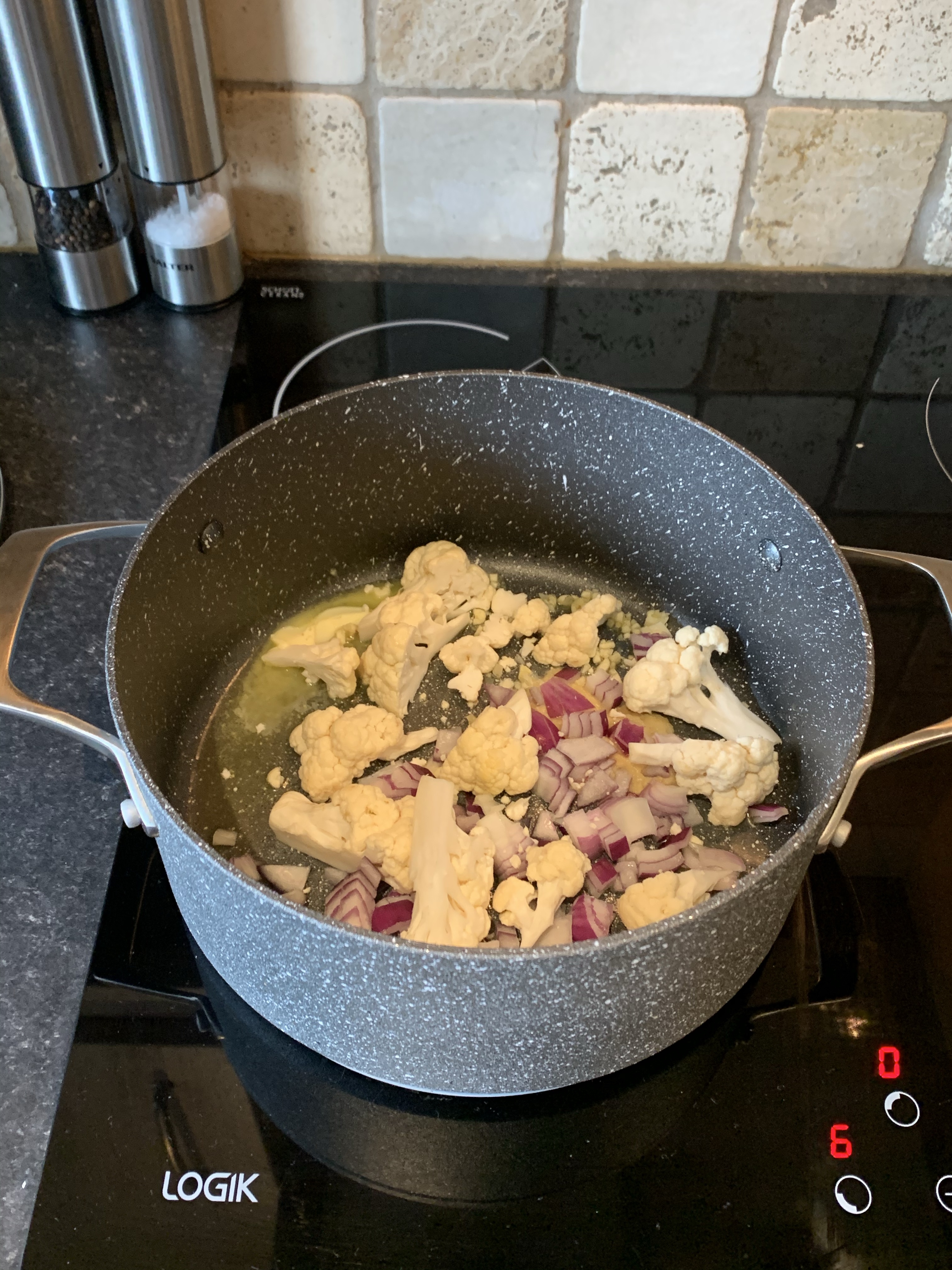 - Heat a large saucepan over medium heat with 1 tablespoon of butter. Add in diced onion, garlic, grated ginger, and cauliflower florets. Cover and let cook, stirring every 2-3 minutes until the onion is translucent, and cauliflower begins to soften.