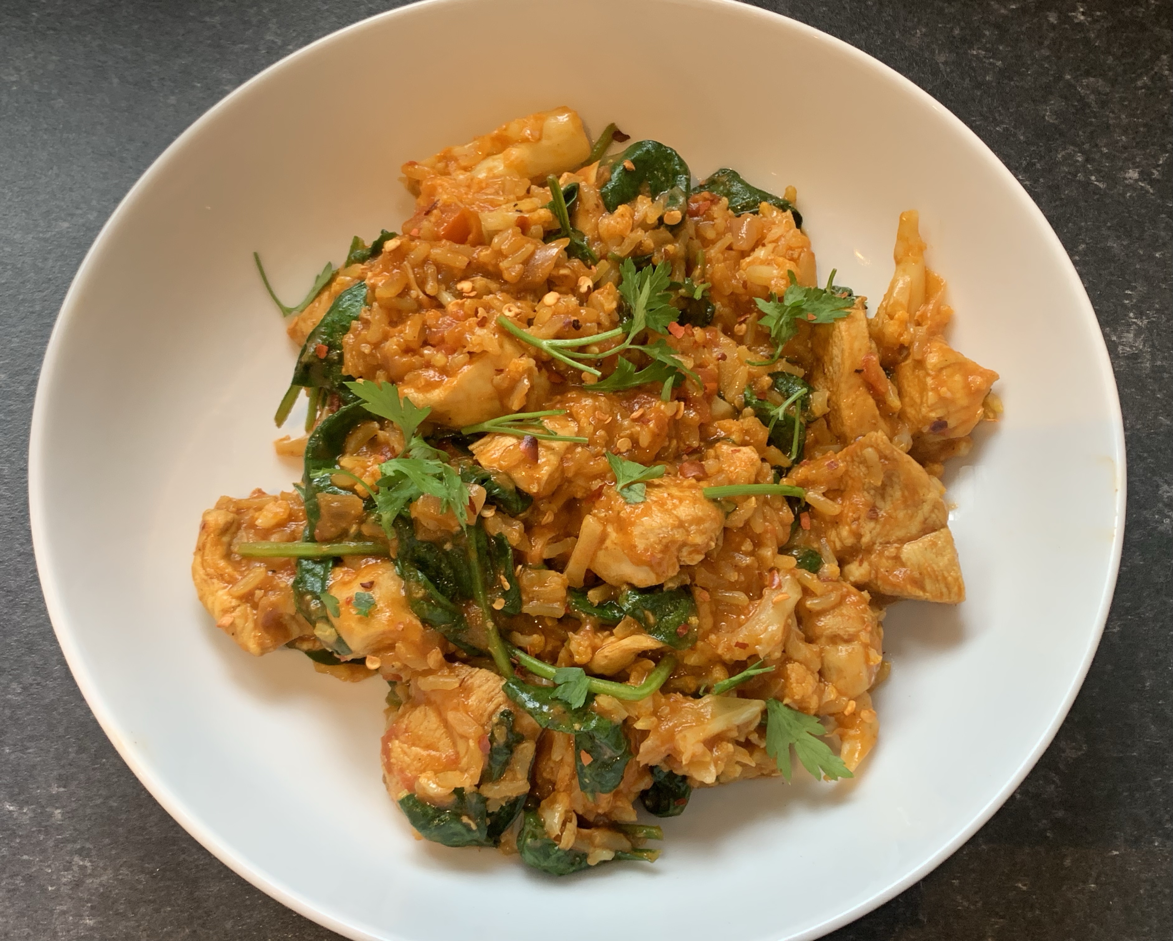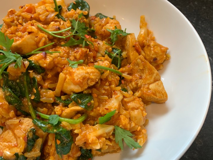 A little twist on a curry dish, this meal is what I would describe as more of an Indian Risotto, packed full of flavour as well as being low in sugar and saturated fat. I got the inspiration for this dish from “Lexi’s Kitchen”. This recipe would be good to make as a “Fakeaway” and is perfect for batch cooking too. Don’t be scared off by the large ingredients list – the spices in this dish are all staple spices that I would recommend to have in your cupboard if you like making any sort of curry.