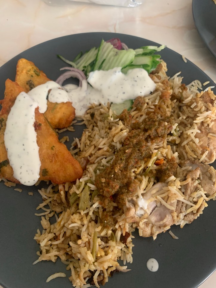 I got to try the Chicken Biryani – so fresh and delicately spiced with mouth-watering herbs and chicken cooked on the bone that just melted in the mouth. This came with a refreshing cucumber and onion side salad and I was also lucky to try the vegetable fritters with mint yogurt and spicy salsa sauce too. All absolutely delicious and all fresh and made 2 streets away!