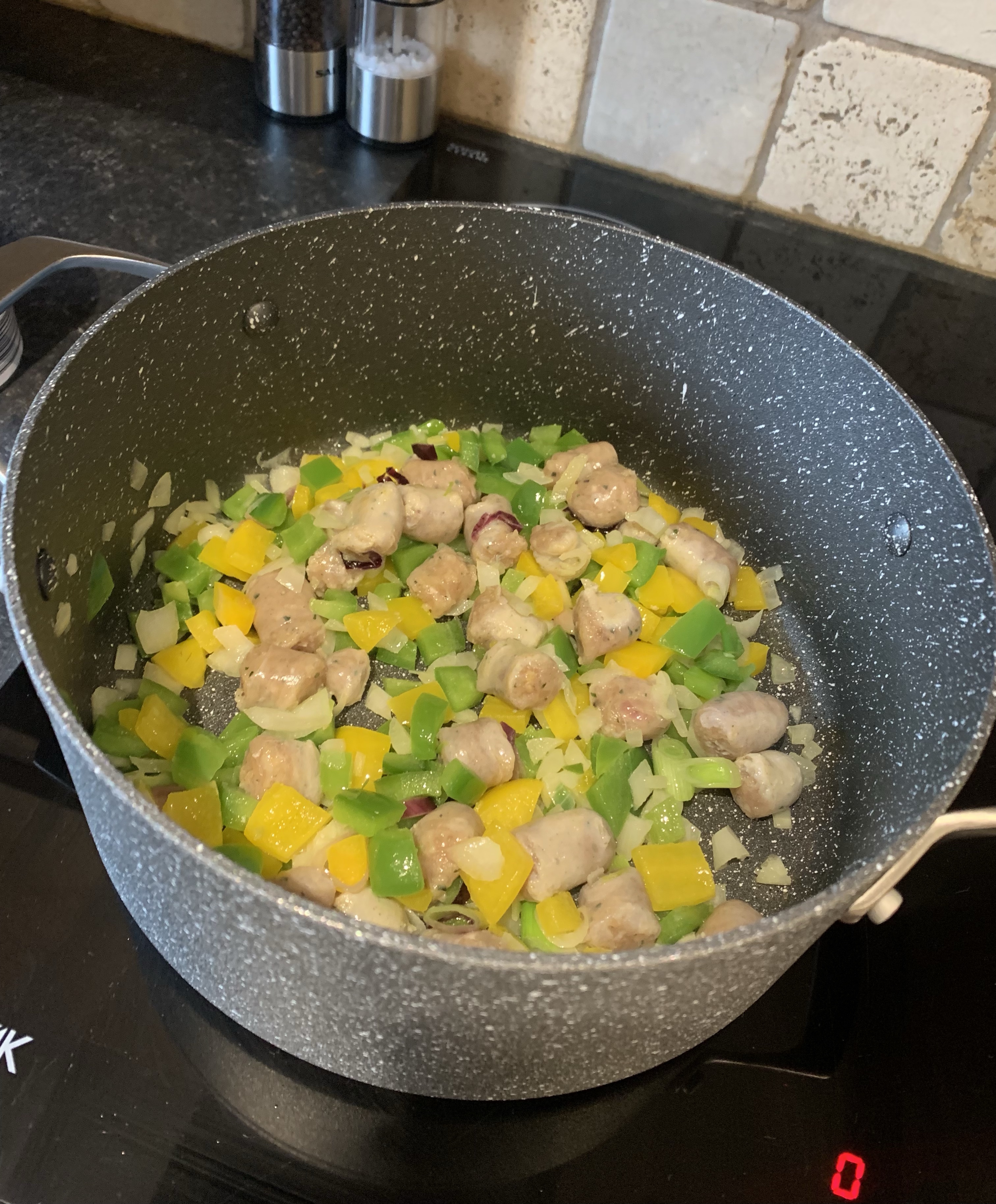 - Add the chopped sausages to the pan with the softened vegetables for approx. 5 minutes until browned slightly and cooked through.