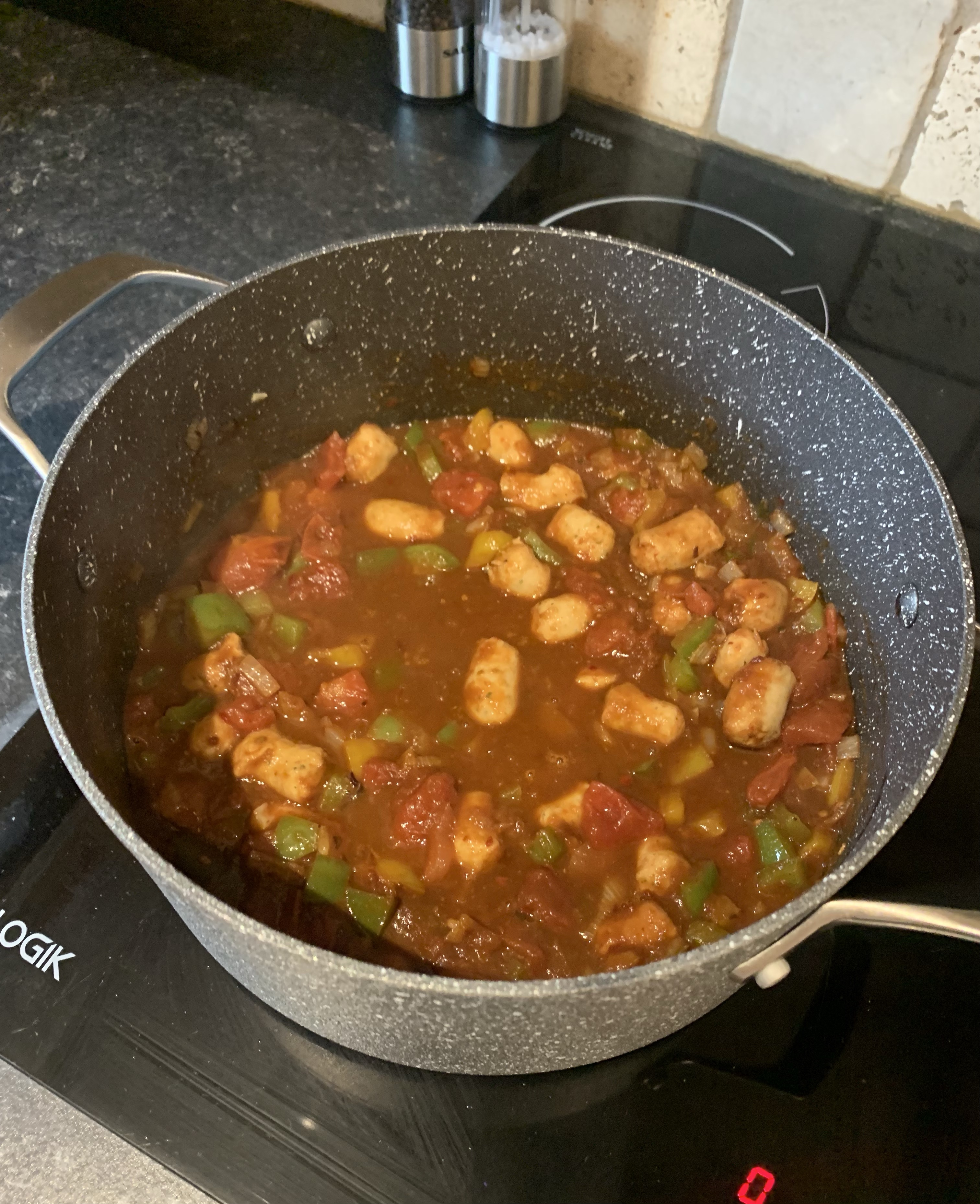 - Now add the garlic and chopped chilli to the pan for a minute or so, then pour in the chopped tomatoes adding a little water. Give everything a good mix, season well and simmer for 10 – 15 minutes. Meanwhile, put your pasta on to cook according to packet instructions (usually 12 – 15 mins in boiling water).