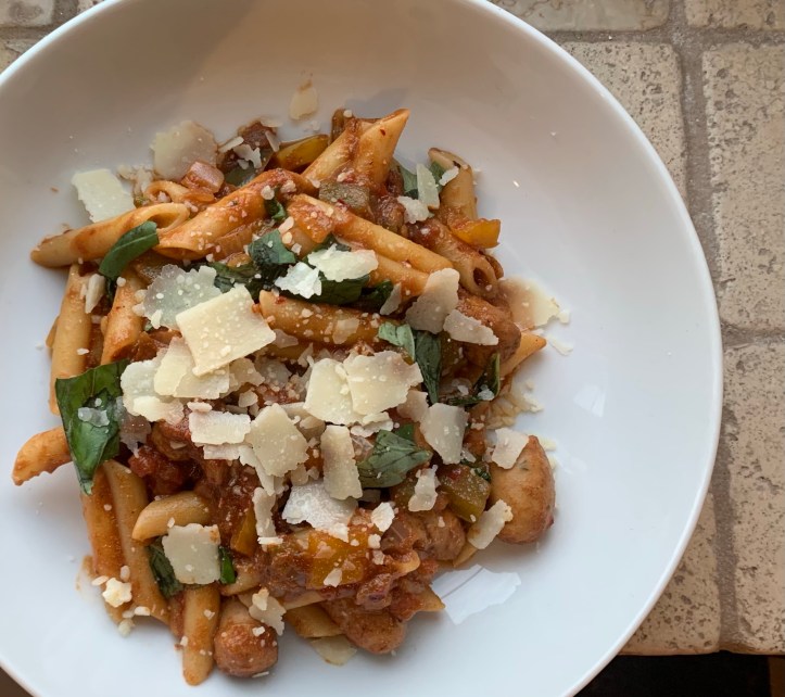 - Serve up your gorgeous sausage + pepper pasta into bowls and top with the hard cheese and remaining basil and enjoy 🙂