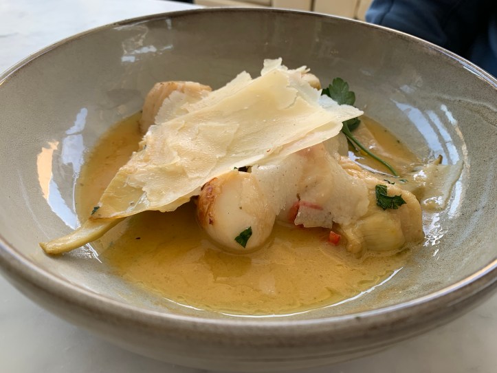 Ben went for; CAPESANTE CARCIOFI – Pan fried king scallops served with Italian artichokes, chilli, garlic and a white wine and butter sauce. I allowed him to order the fish (haha!) however I didn’t try these but I hear they were cooked perfectly and were delicious and they smelt it too!