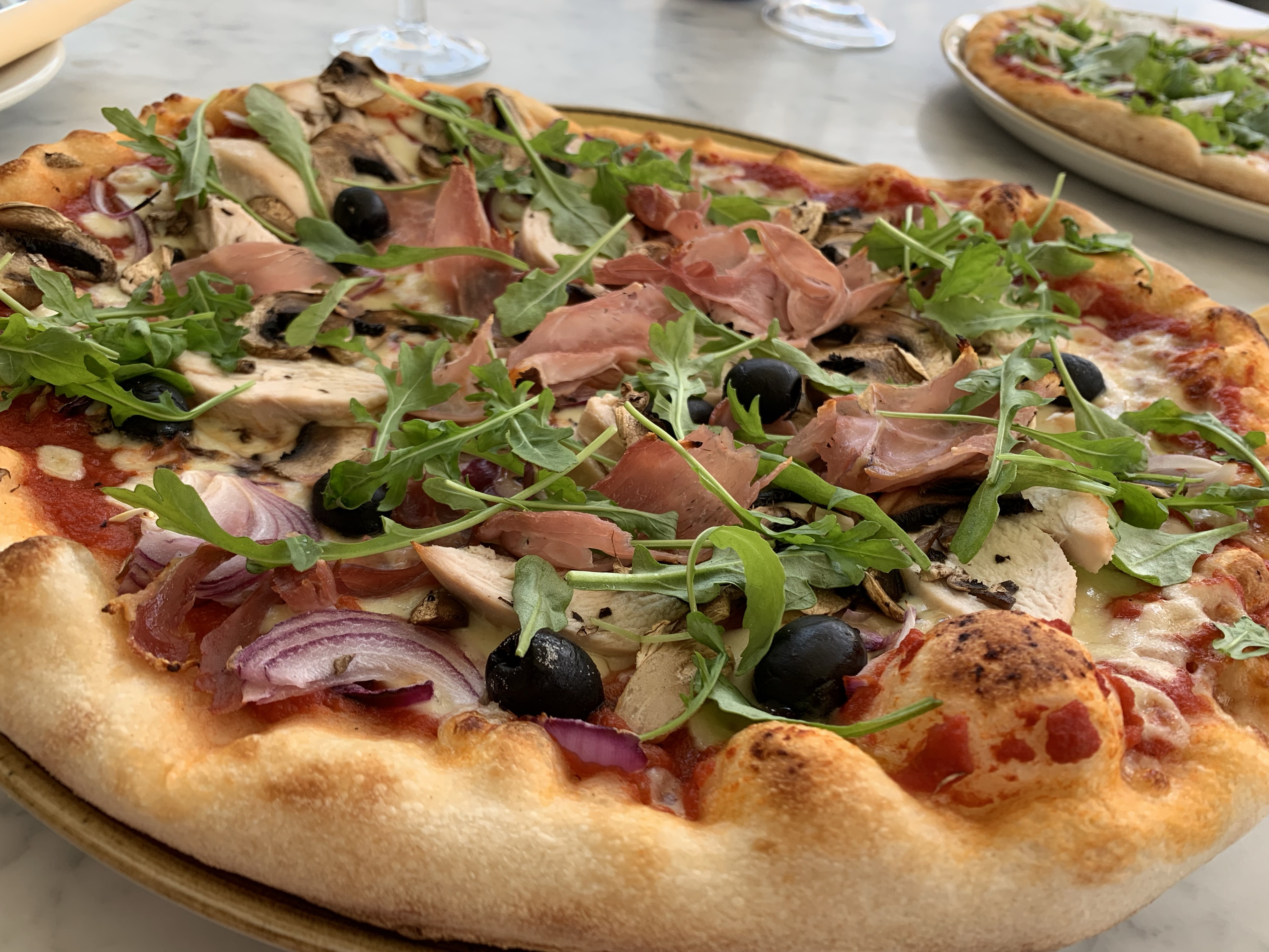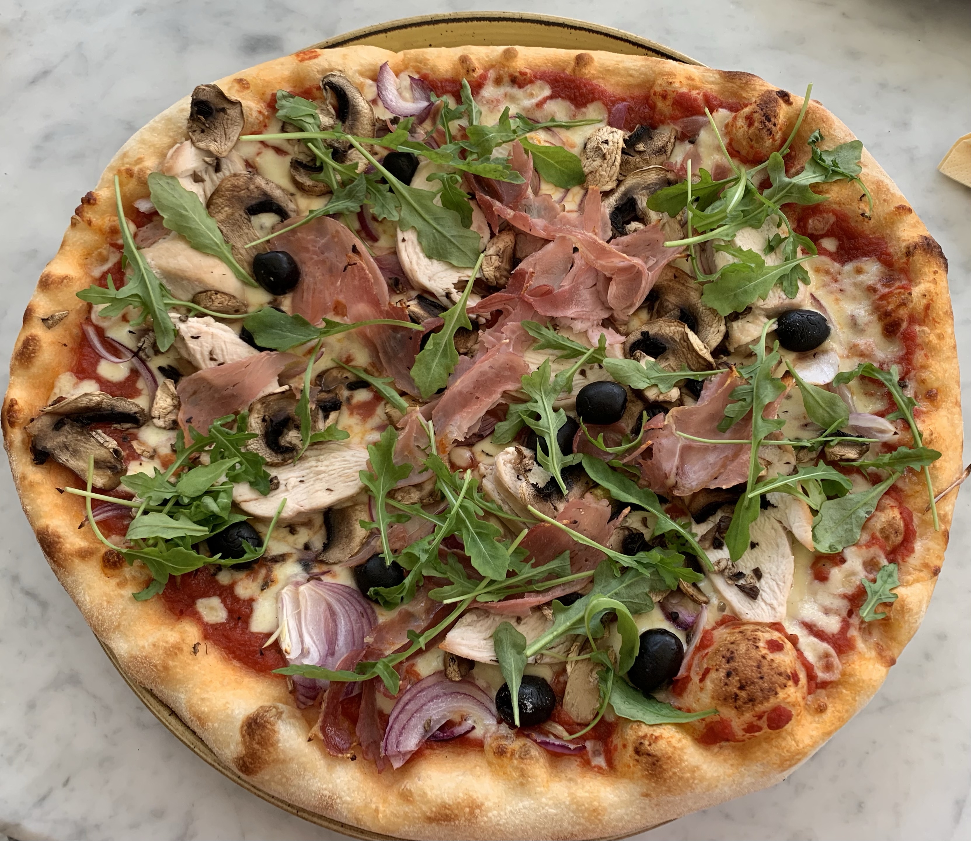 SANT ANGELO SPECIAL – A crispy based pizza, topped with tomato sauce, fior di latte cheese, mushrooms, roast ham, grilled chicken, rocket salad, black olives and red onions.