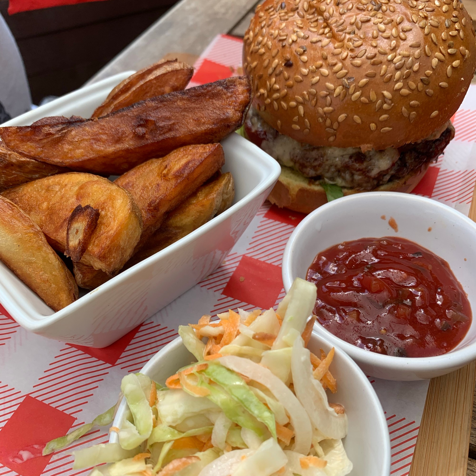 sauce. Usually comes with “skinny fries” (more like oven chips) but my Dad doesn’t like the whole skin-on fries, which seems to be the only choice nowadays so he mistakenly swapped them for “chunky chips” which were pretty much skin on potato wedges. Not a fully happy customer haha but just do you know in case you also didn’t like skin on chips/fries. Burger was great though!