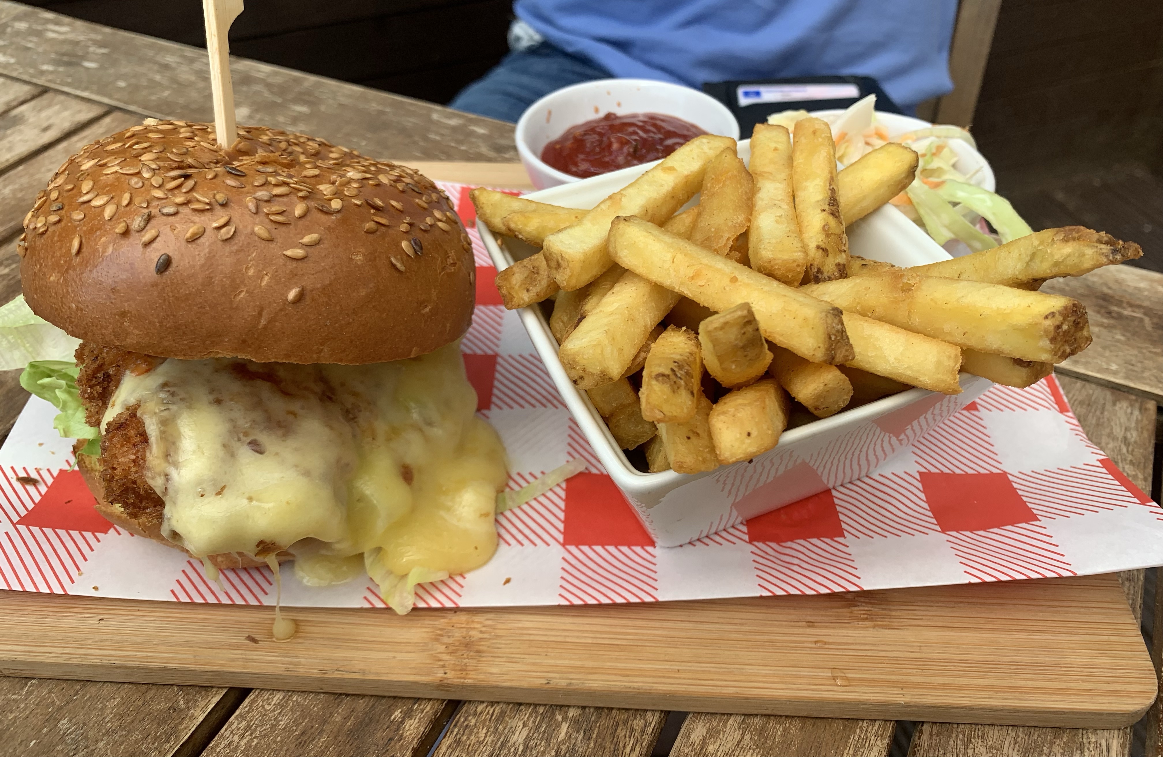 Southern Fried Chicken Burger – topped with melted cheddar cheese. Super burger with LOTS of cheese and all burgers come with coleslaw and relish on the side as well as chips, which is good too!