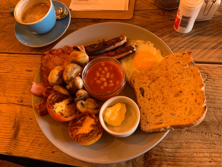 Ben went with a good old All Day Breakfast (bargain at £7), which of course I had a nibble of. A large plate full of perfectly cooked food; 2 sausages, 2 bacon (cooked really well i.e. not fatty! and just crisp), juicy mushrooms, grilled tomatoes, beans, fried egg and toast with butter. Everything was delicious, hot and very filling – a great kickstart to the day!