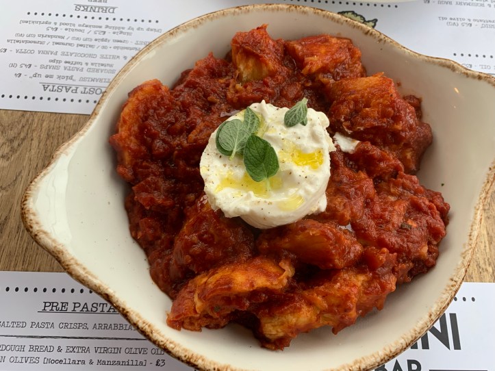 We also got a side of Burrata, tomato nduja sugo & sourdough bread which I expected to be crusty bread to dip in but the bread was baked in the sauce which made it soak it all up and was actually surprisingly enjoyable but just a warning for anyone who doesn’t enjoy the texture of “soggy” bread.