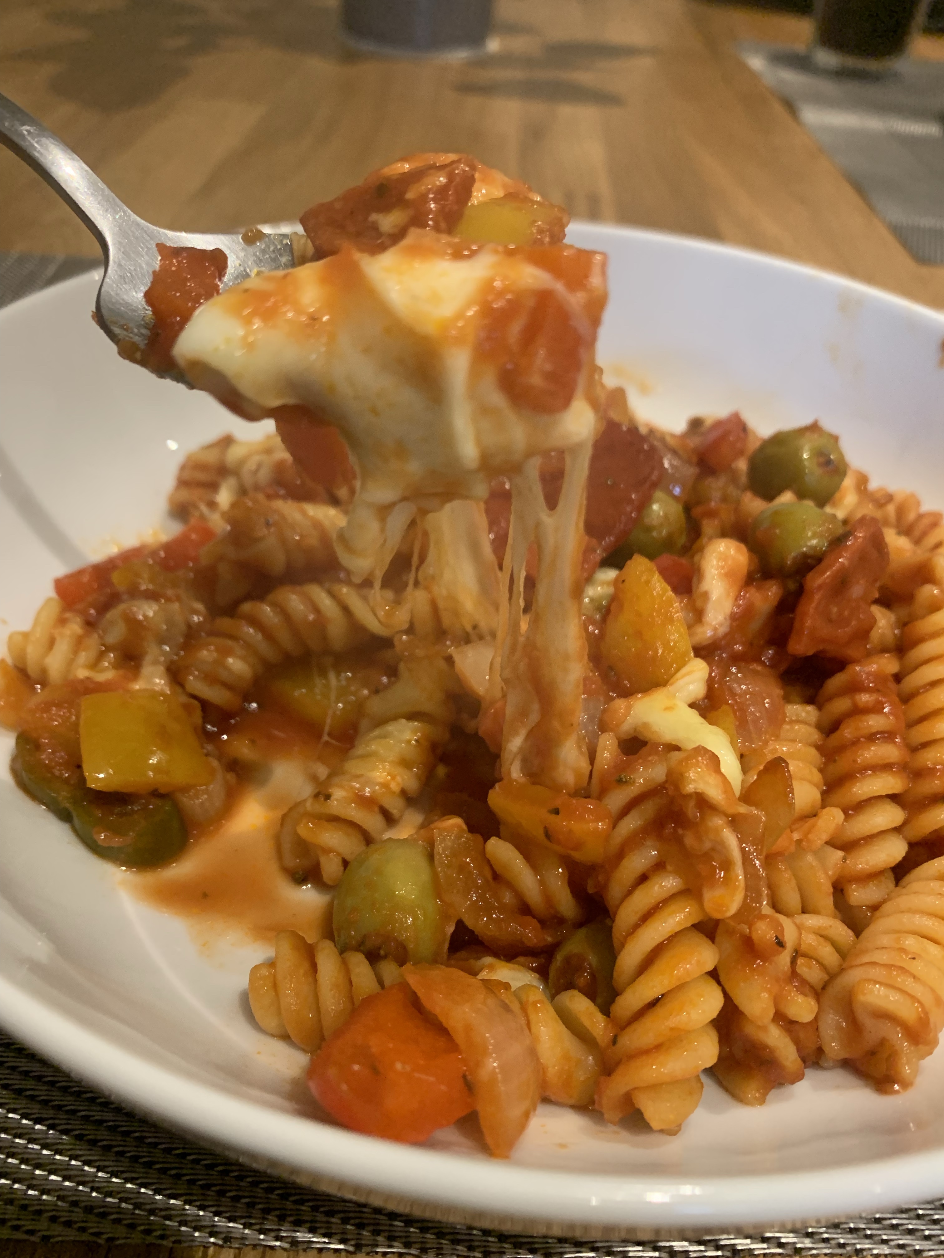 - Tip the cooked pasta into an ovenproof dish, pour over the sauce and stir until the pasta is coated. Sprinkle the pasta with the mozzarella and cheddar and top with the remaining pepperoni.