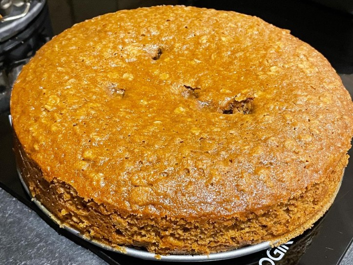 - Pour the mixture into the tin and bake for 50 mins – 1 hr until the cake feels firm and a little crusty on top.