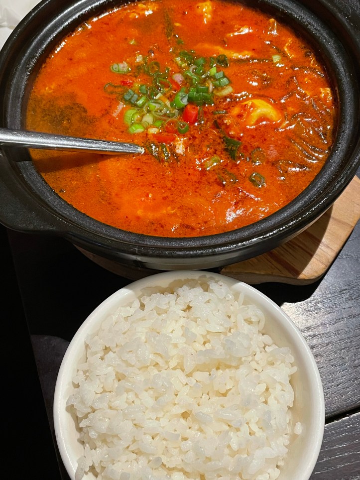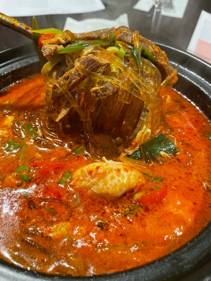 For my main dish I chose the Korean Spicy Beef Noodle Soup – Slow cooked Korean beef & vegetable spicy vermicelli soup. The noodles were Mung Bean Thread Vermicelli (Glass Noodles) which I had never had before. They were very slippery haha so I made lots of mess but they were yummy and the soup itself was delicious and packed with chillies giving off a great kick! This dish came with a little pot of boiled rice that I added to the soup to soak it all up.