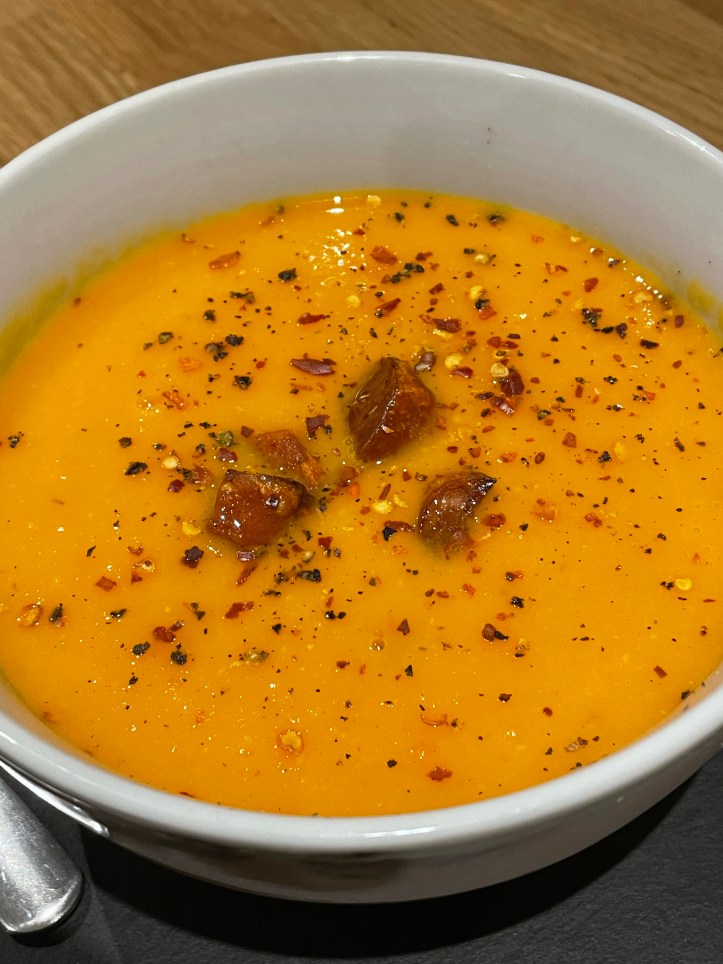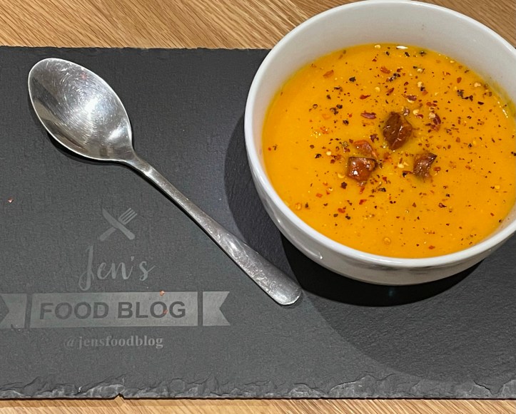 This soup is a warming, delicious lunch option perfect for this time of year. It’s healthy, easy to make and low calorie too at 250 per portion! It’s great how creamy the soup is just from adding a little coconut cream and blitzing everything together. Give it as little or as much spice as you want with added chilli flakes to serve. How inviting does it look??
