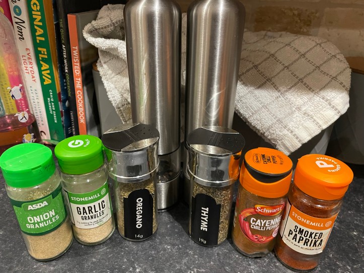 So with all of the below spices in my cupboard, it was easy for me to make a Cajun spice mix that actually tasted authentic. All you need is onion granules, garlic granules, oregano, thyme, cayenne pepper and smoked paprika. Yes I know you can probably buy a ready made Cajun spice mix but as I say, these herbs and spices will go towards many more recipes and I think it’s fun doing it from scratch! Here’s my full recipe below.