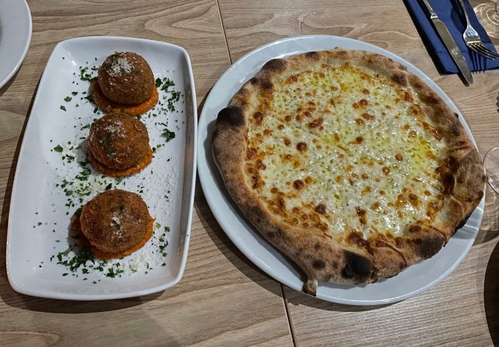 Before we went, a number of people had recommended the Arancini starter to us, so we decided to share this between the 3 of us with some cheesy garlic bread too. The arancini was really good, 3 large pieces each with a different filling; Pesto, Bolognese Ragu and Dolcelatte Blue Cheese. I am not sure I can pick a favourite, I enjoyed trying them all! The cheesy garlic bread was VERY garlicky and very cheesy, a little greasy, but was a tasty, comforting starter (glad I wasn’t on a first date with this one haha!)