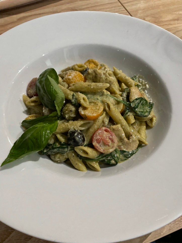 The pasta dishes coming out of the kitchen looked that good they convinced the other 2 ladies who were going to have a pizza initially, to order a pasta dish. I already knew I wanted pasta as I usually do 99% of the time when dining out at an Italian. It was a tough choice between the Penne Pesto Pollo or Ravioli Burro I Salvia (Ravioli filled with ricotta & spinach, cooked in sage & butter with pine nuts). I went for the Penne Pesto Pollo in the end – a large and tasty dish of chicken breast with spinach, olives & cherry tomatoes with cream & basil pesto. I enjoyed this, although there was a lot and when I got home I felt I had eaten too much but I really didn’t want it to go to waste!