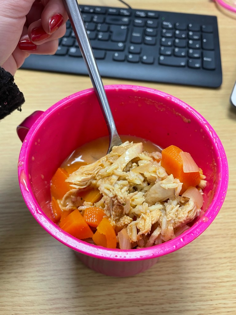 Curried Chicken & Rice Soup (Stews & Soups) 274 calories – Worth every calorie for this filling & warming lunch that we took to work.
