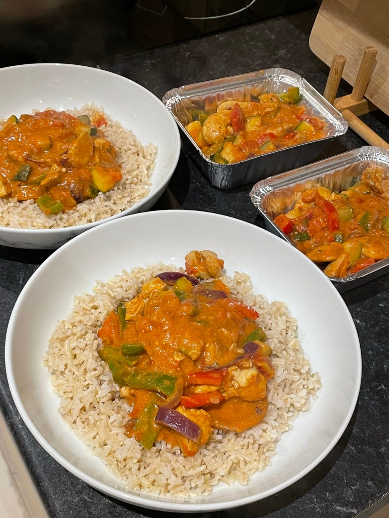 Curried Sausages (Batch Cook) 394 calories – We had some sausages and veg to use up and we always like a curry so this was a good recipe to use up some ingredients. I might have put a little bit too much sweet potato in though as the sauce when blitzed came out really thick and I had to keep adding water to the pan. We had these with the garlicky green beans (another PON recipe on their website).