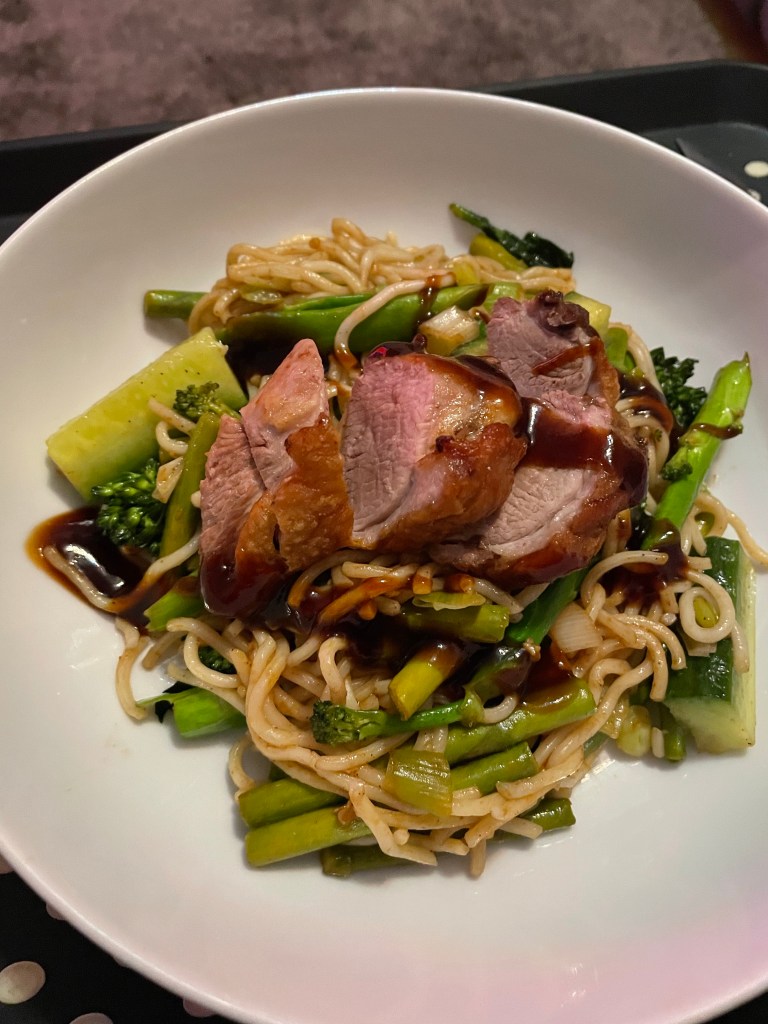 - Serve the noodles and veg into bowls, tops with the sliced duck and drizzle the rest of the hoisin sauce over and enjoy!