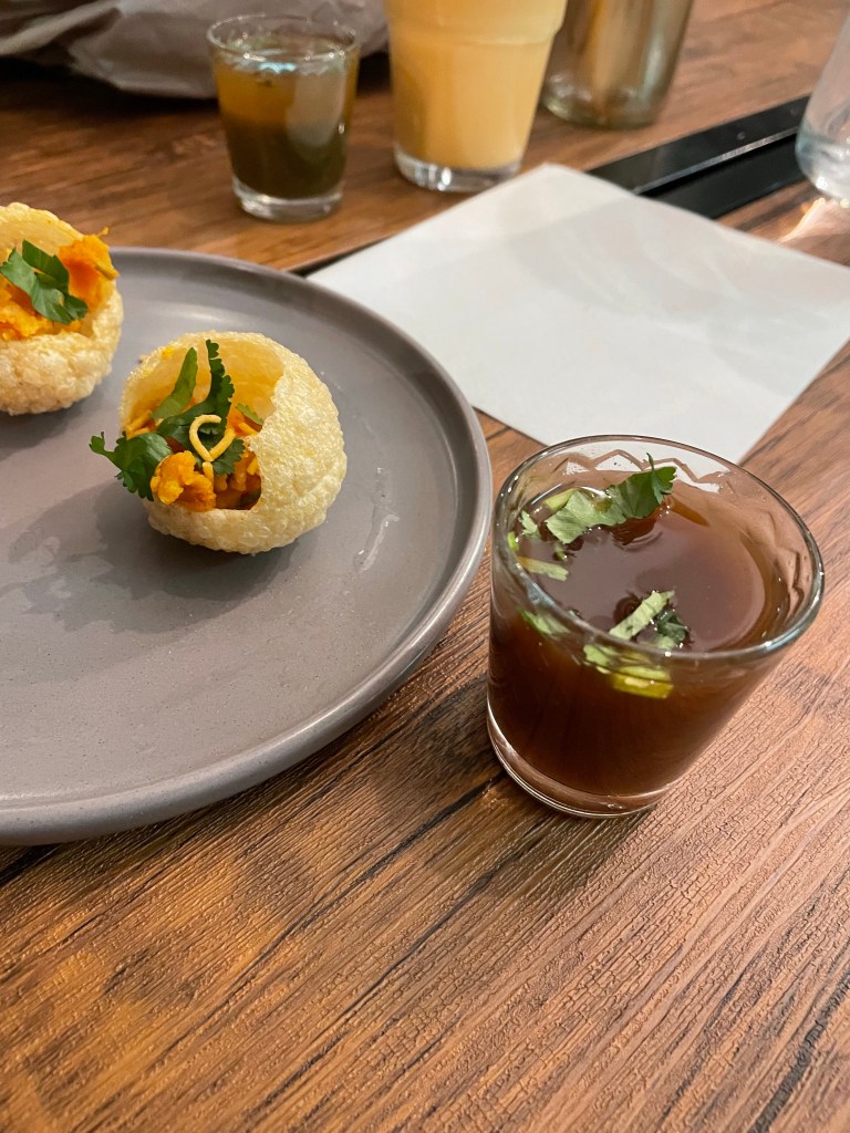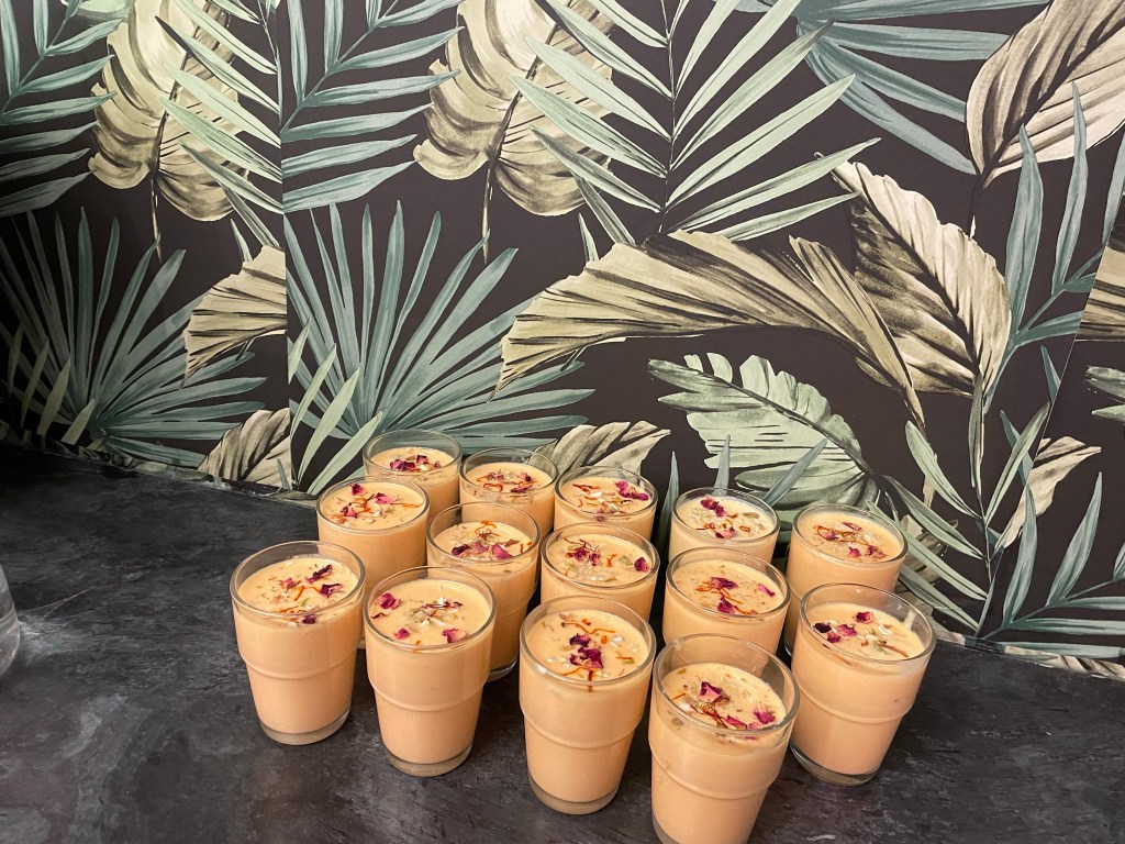 As part of our visit we were welcomed with some complimentary cultural street chaat; Vegan Gol Gappa (also known as Pani Puri), a popular bite-size chaat consisting of a hollow, crispy-fried puffed ball filled with masala potato, onions, spices and served with Teekha-Meetha Pani (sweet & spicy flavoured water) and fresh coriander. The trick is to pour the liquid into the chaat ball and eat it all in one! A great combo of spices and something different to add to the whole experience. We also had a welcome drink of Mango-Saffron Royal Lassi which was delicious and something I had never had before.