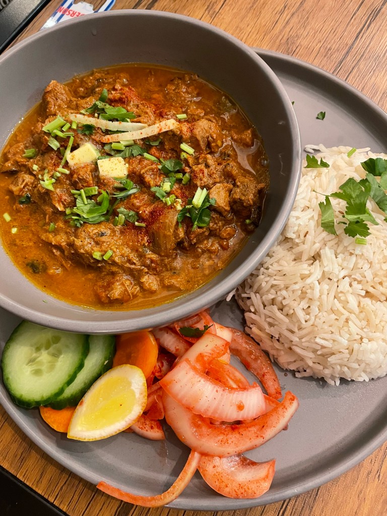 For my main I went for the Butter Paneer as I had to have SOMETHING paneer of course. A lovely, rich sauce just with a hint of chilli but lots of flavour, served with a large portion of jeera rice and a bit of a side salad – I loved the onions on the side! I mixed everything in to my curry, it was lovely. Ben went with the traditional lamb curry which had an almost smokey flavour to it and was spicier than my main and really delicious.