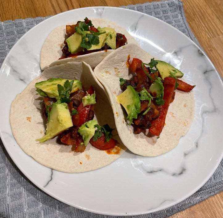 - Warm the tortillas in the microwave or wrapped in foil in a low oven. Serve the wraps with the peppers, beans, avocado, extra coriander and extra lime wedges to squeeze over, if you like.