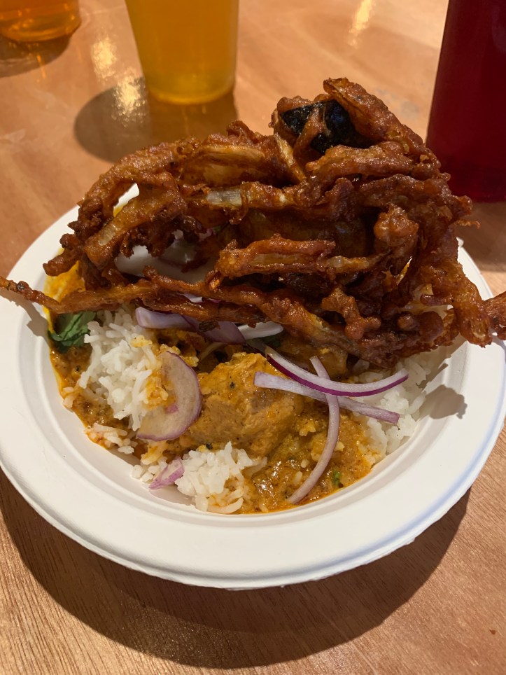 Next I chose the Spicy Biker and their Mum’s Special Recipe Chicken Curry to share for £8. The wait for food here was a bit longer, approx. 15 minutes but everything was cooked fresh and I added a Bhaji on for £2 that came straight out of the fryer on to my plate! The curry was lovely, it had a unique taste to it, almost slightly minty and was nice and rich and fresh. The onion bhaji was perfect too and had potatoes & aubergine mixed in as well which really added to this Indian snack. Another yummy dish to enjoy between us and after that and a few beverages, we were just about full!