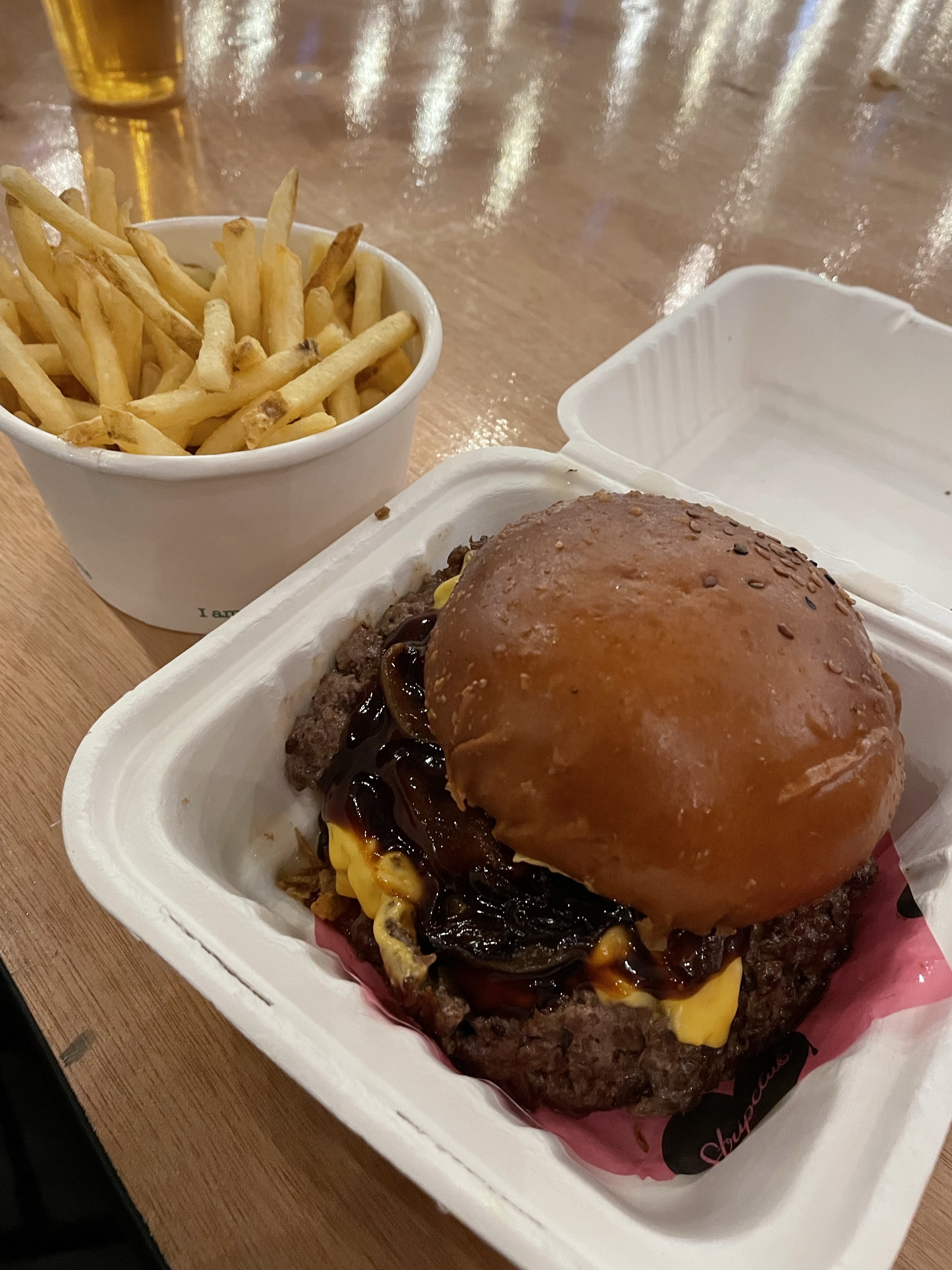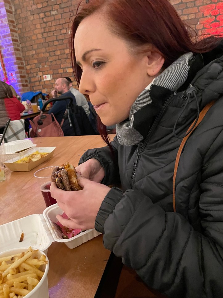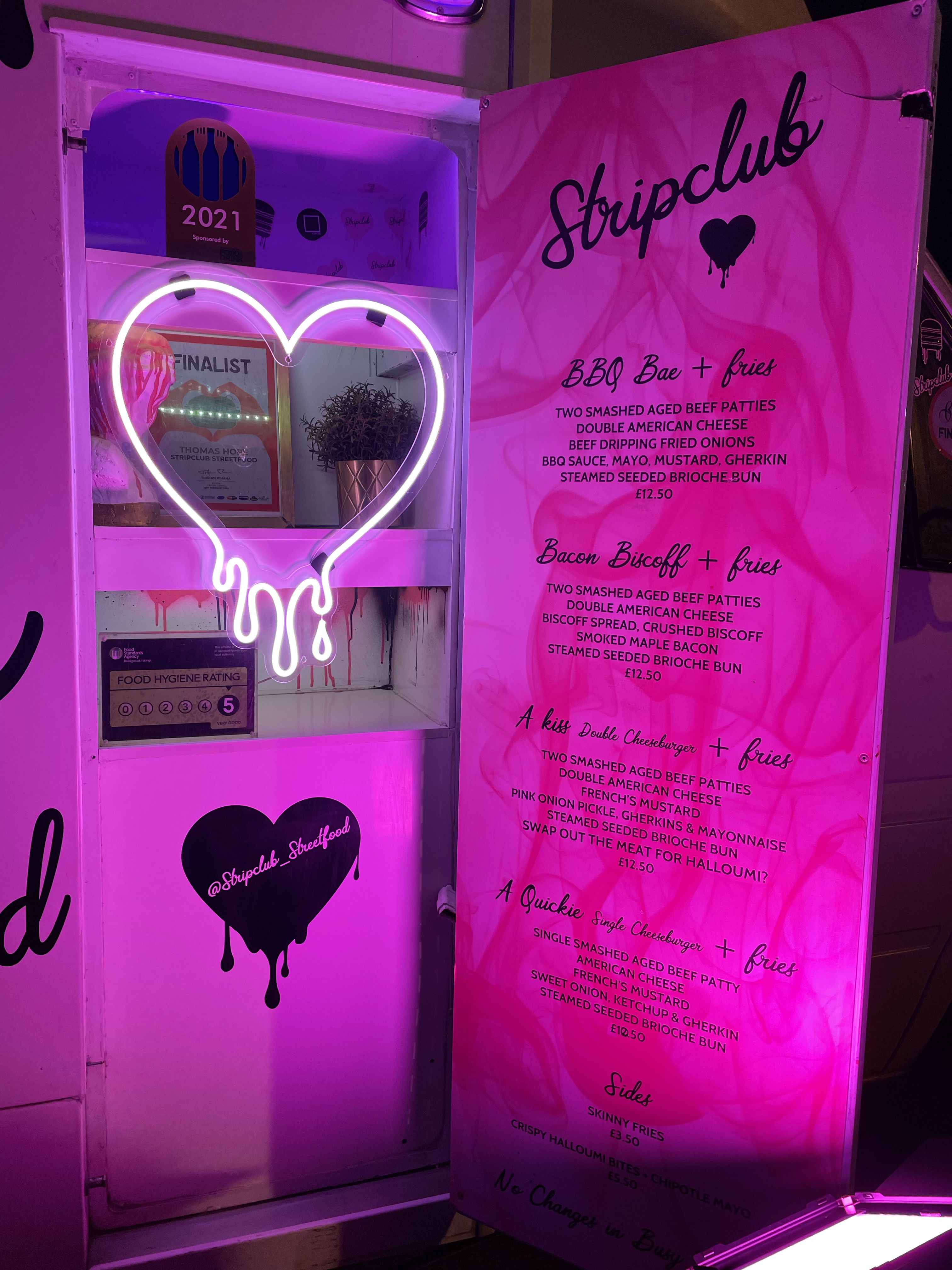 - StripClub Street Food – flipping up some great sounding burgers & fries. I went with the BBQ Bae Burger which was 2 aged beef patties, american cheese, beef dripping fried onions (won it for me), BBQ sauce, mayo, mustard,gherkin and all in a brioche bun. This was a great burger, massively messy but bloody lovely. I liked the tongue in cheek-ness about the whole brand.