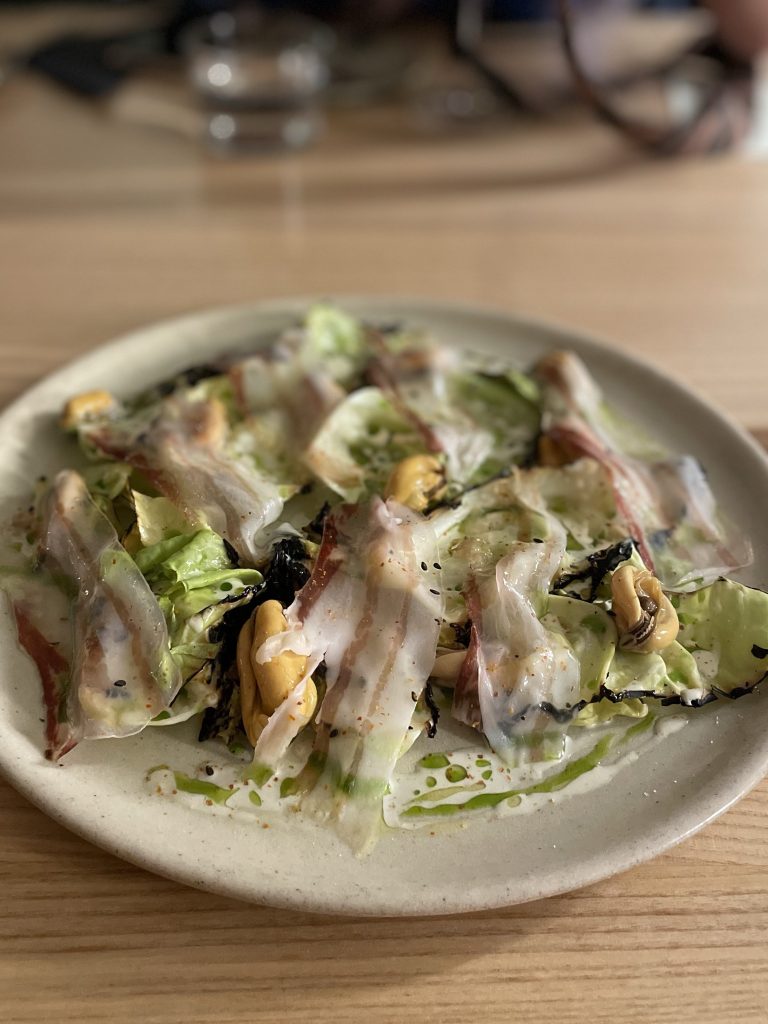 - Hispi cabbage, pickled mussels, burnt cream, pancetta. I didn’t have the mussels but this cabbage salad was well flavoured and another good veggie side dish.