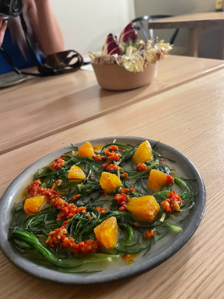 - Agretti, blood orange, chilli. Agretti is a Mediterranean crop related to spinach and beet but reminded me of samphire. This dish gave out mouthwatering flavour and we soon ordered the sourdough bread to mop up all the juice!