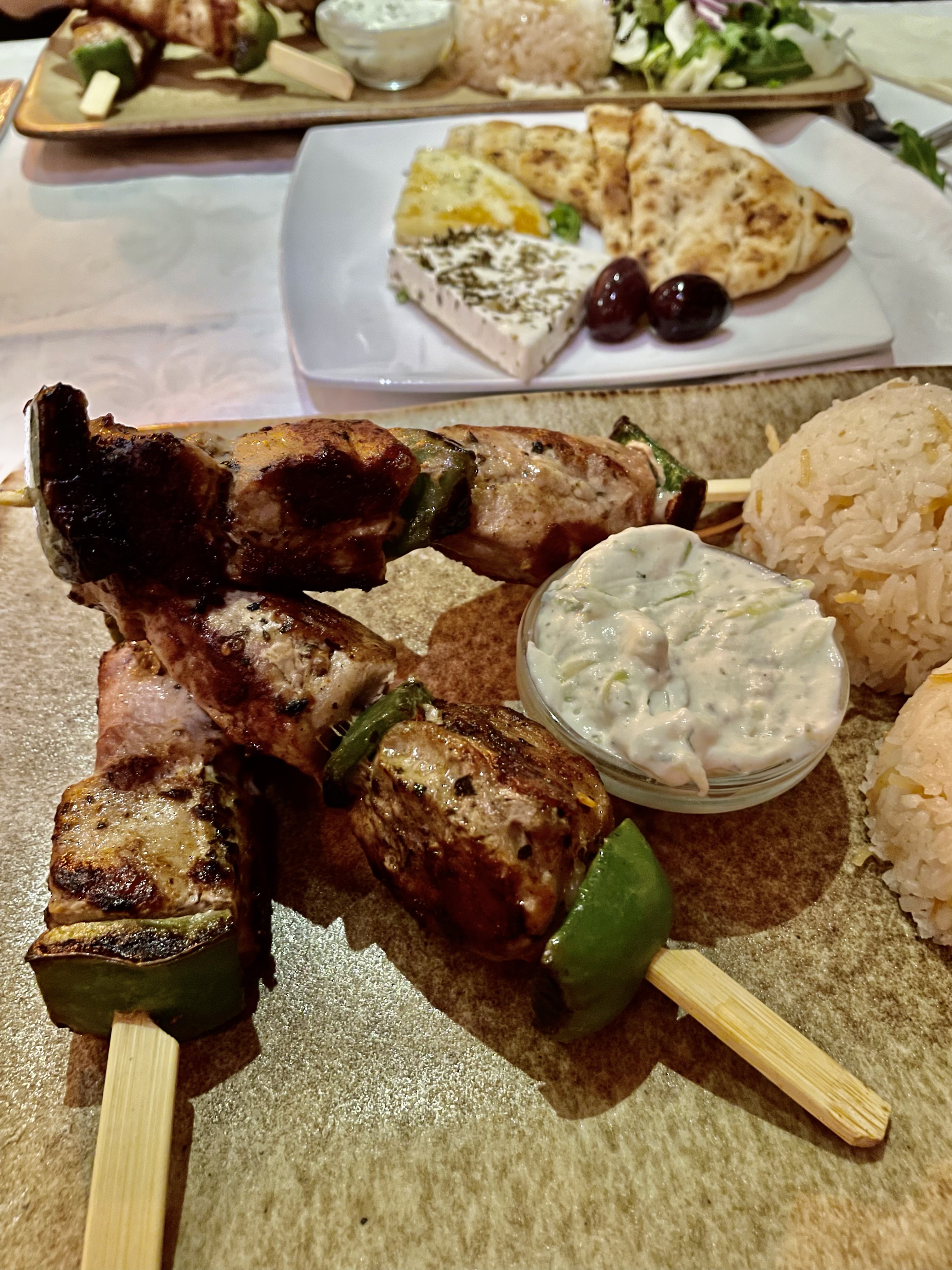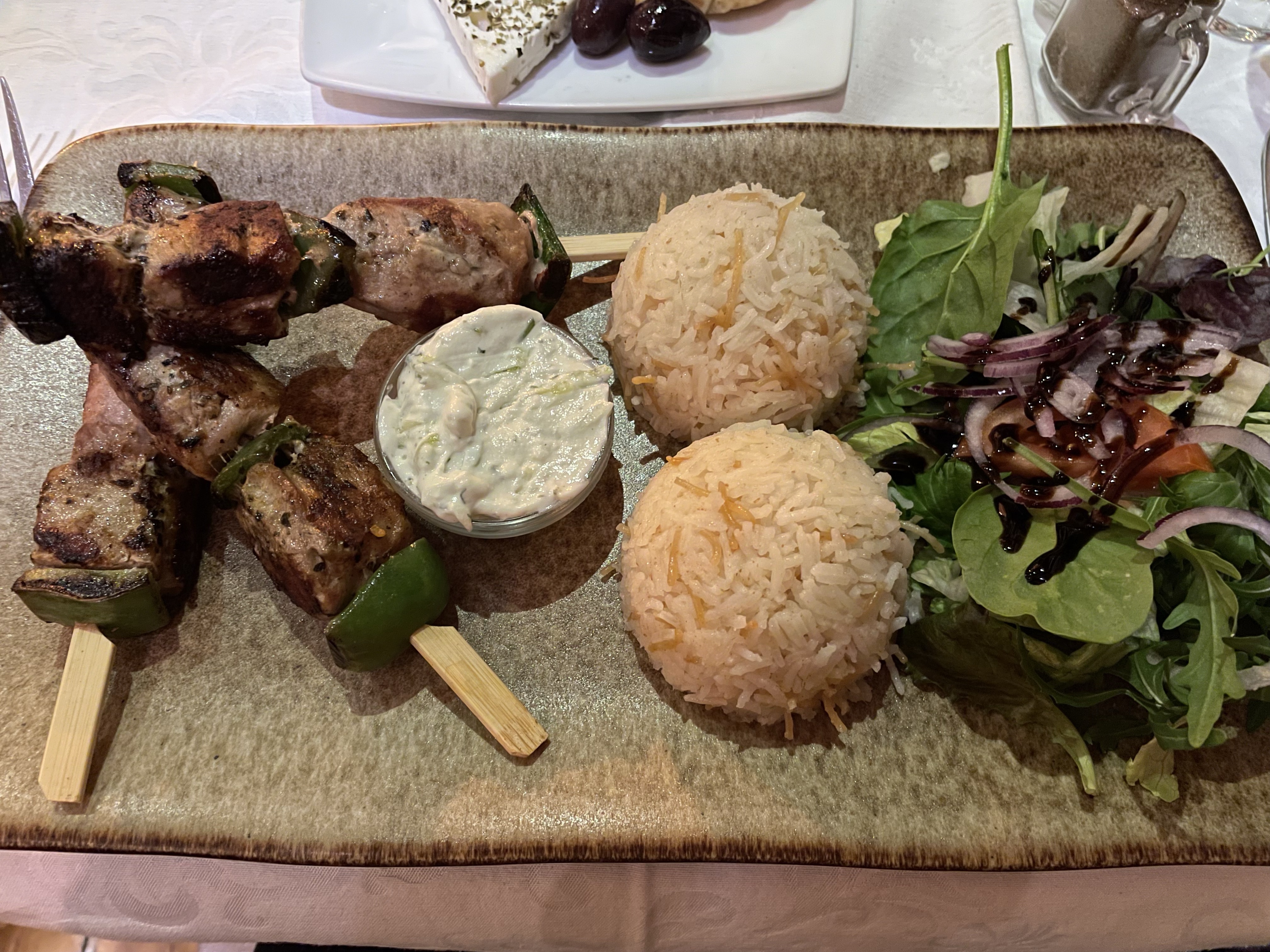 As tempting as Gyros was, we knew the starter was going to be quite filling so opted for a “lighter” plate for our Main Course and both went with the Pork Souvlaki. Still a great portion size, the pork was served on 3 skewers and was cooked delightfully well and tasted spot on. The rice and salad to accompany were also perfect. We couldn’t manage to eat everything but again were more than happy to take a doggy bag!