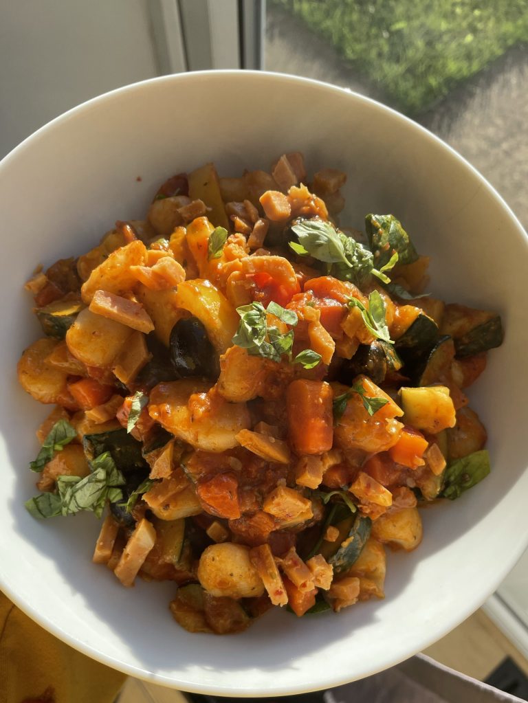Sometimes all I want is a piled high, colourful bowl of healthy and filling goodness – this dish definitely provides that! Packed full of veggies and balanced out with some cheese and gnocchi, this tasty vegetarian meal is fresh, guilt-free comfort food at it’s best. The below recipe provides two large portions but we had the calories spare, so it might be that you make this into 3 portions instead. Total calories = Approx. 616 per person.